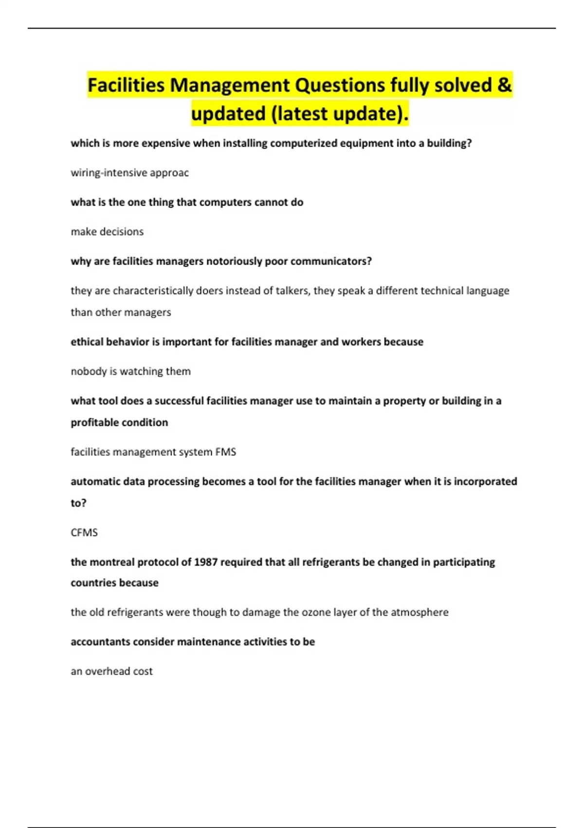 Facilities Management Questions fully solved &