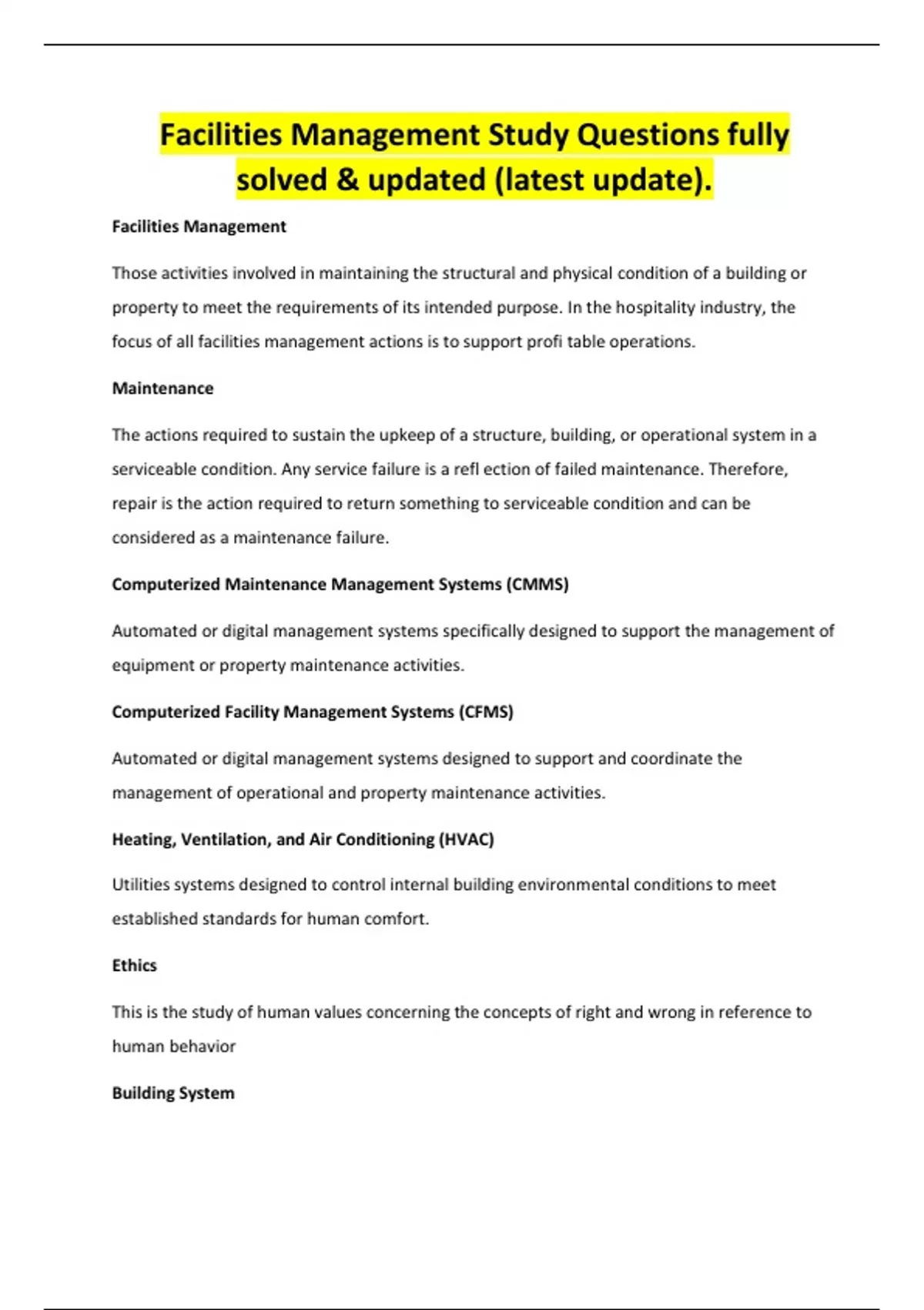Facilities Management Study Questions fully