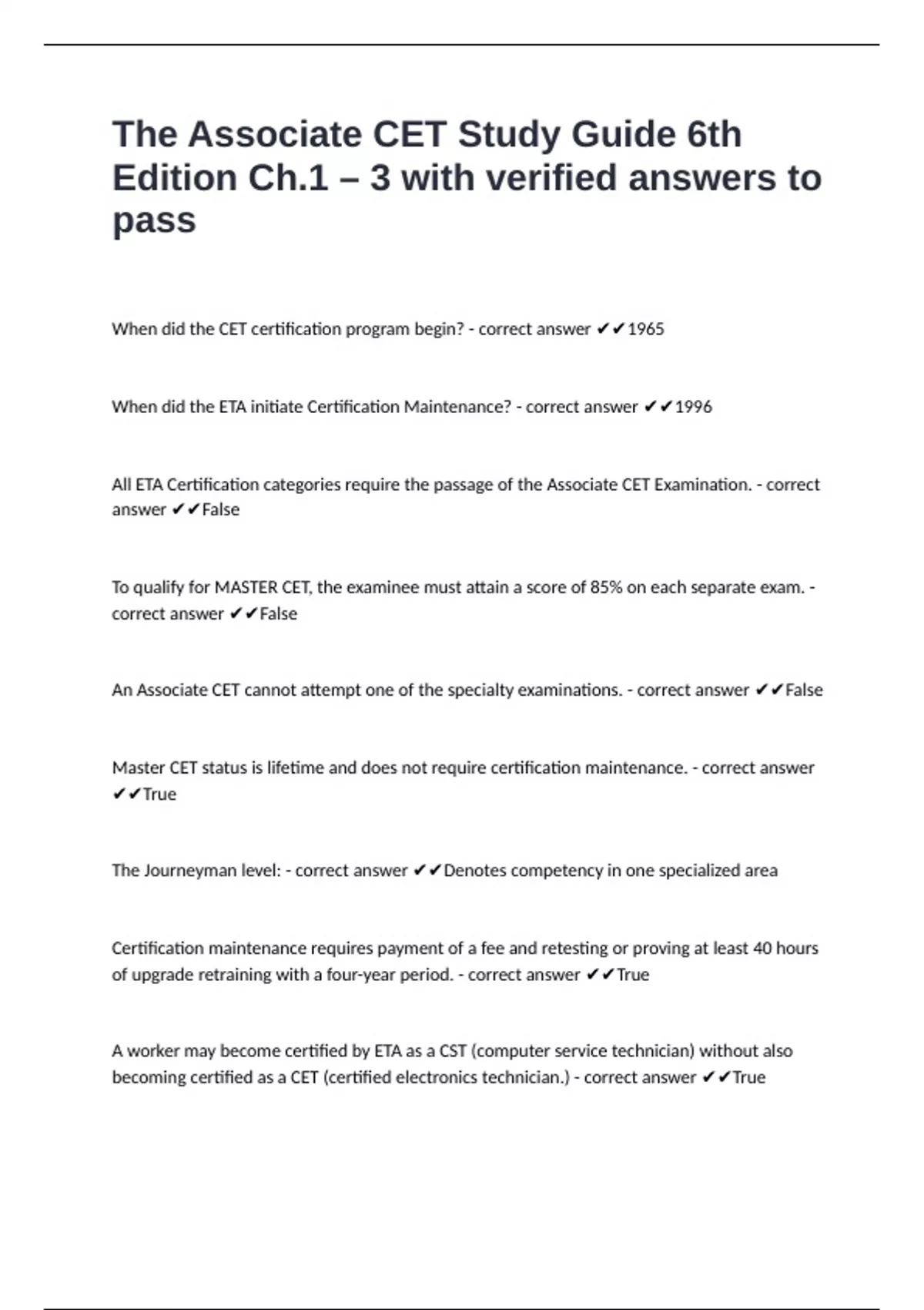 becoming certified as a CET (certified electronics technician.) - correct answer ✔✔True