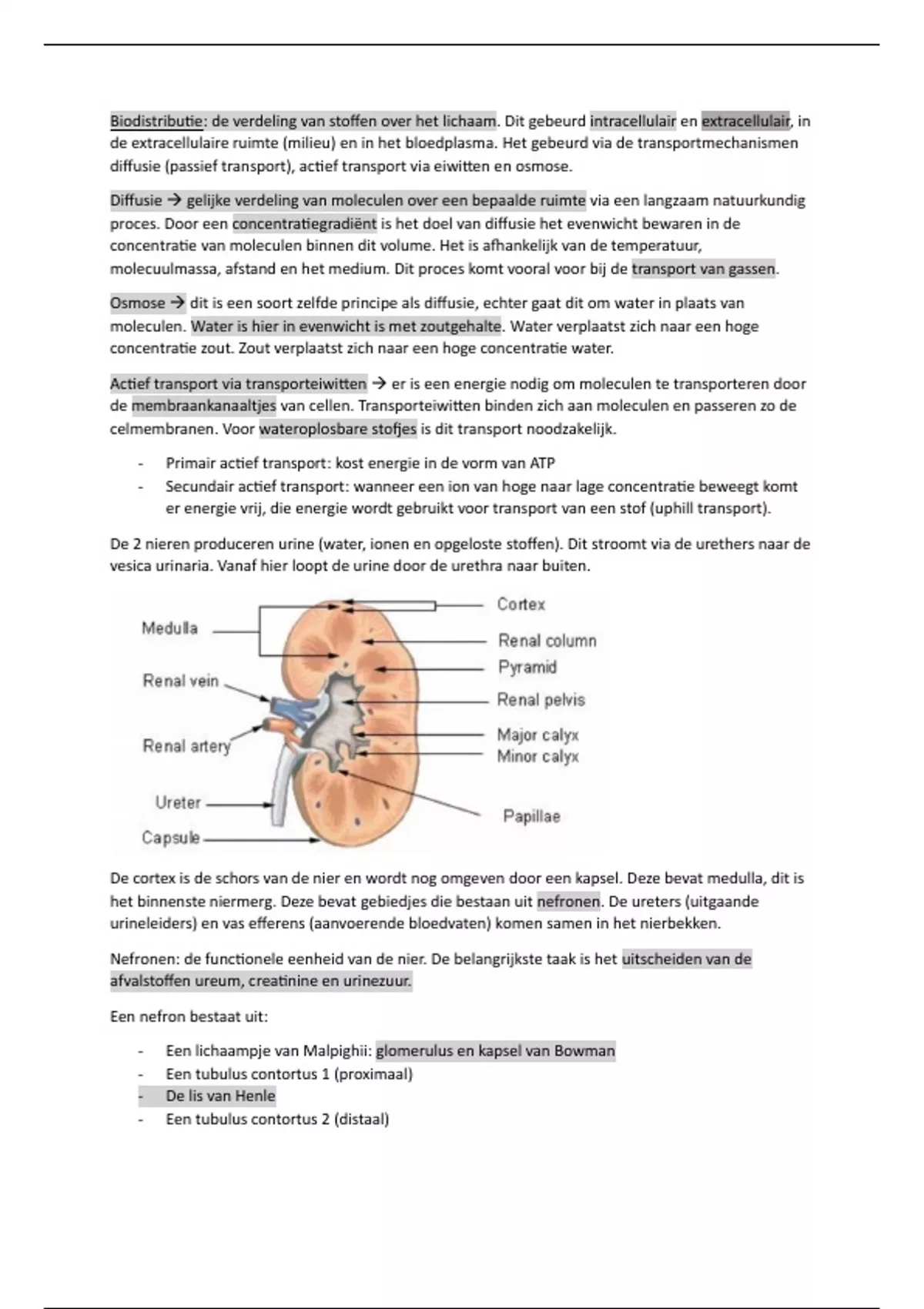 het nefron verwijderd door middel van osmose. Er treed actieve resorptie op van glucose, zouten en