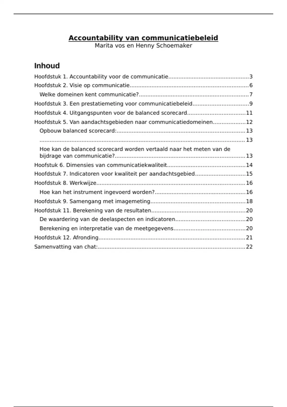 Deze uitgebreide samenvatting behandelt het boek Accountability van Communicatiebeleid van Marita Vos en Henny Schoemaker. Het boek gaat in op de toegevoegde waarde van communicatie binnen organisaties en hoe de effectiviteit ervan gemeten kan worden. Belangrijke onderwerpen zijn onder andere de rol van communicatie in strategisch management, prestatiemetingen, de balanced scorecard en communicatiedomeinen. Ook wordt ingegaan op kwaliteitsindicatoren, de implementatie van een meetinstrument en de samenhang met imagemetingen. Perfect voor vierdieping in communicatiebeleid en verantwoording binnen organisaties.