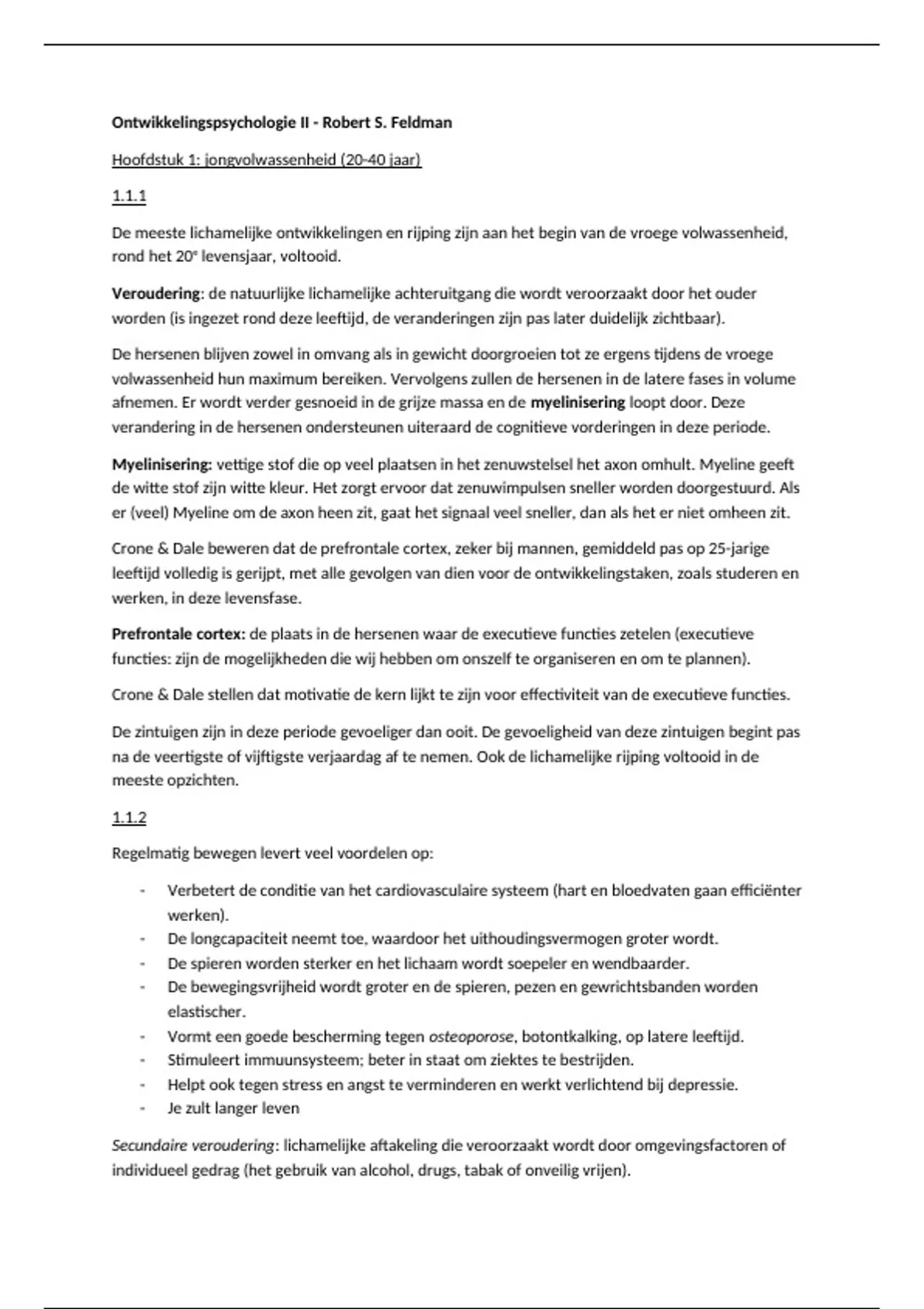 Samenvatting Ontwikkelingspsychologie II - Ontwikkelingspsychologie Robert S. Feldman - Editie 8. De samenvatting is uitgebreid en bestaat uit hoofdstuk 1 t/m 7. De hoofdstukken bestaan uit meerdere sub paragrafen. Niet alle sub paragrafen staan erin, maar wel de meest relevante. Er worden veel verschillende theorieën uitgelegd, en ook de personen die gekoppeld zijn aan deze theorieën worden benoemd. Ook staan er hier en daar plaatjes in om de informatie te verduidelijken.