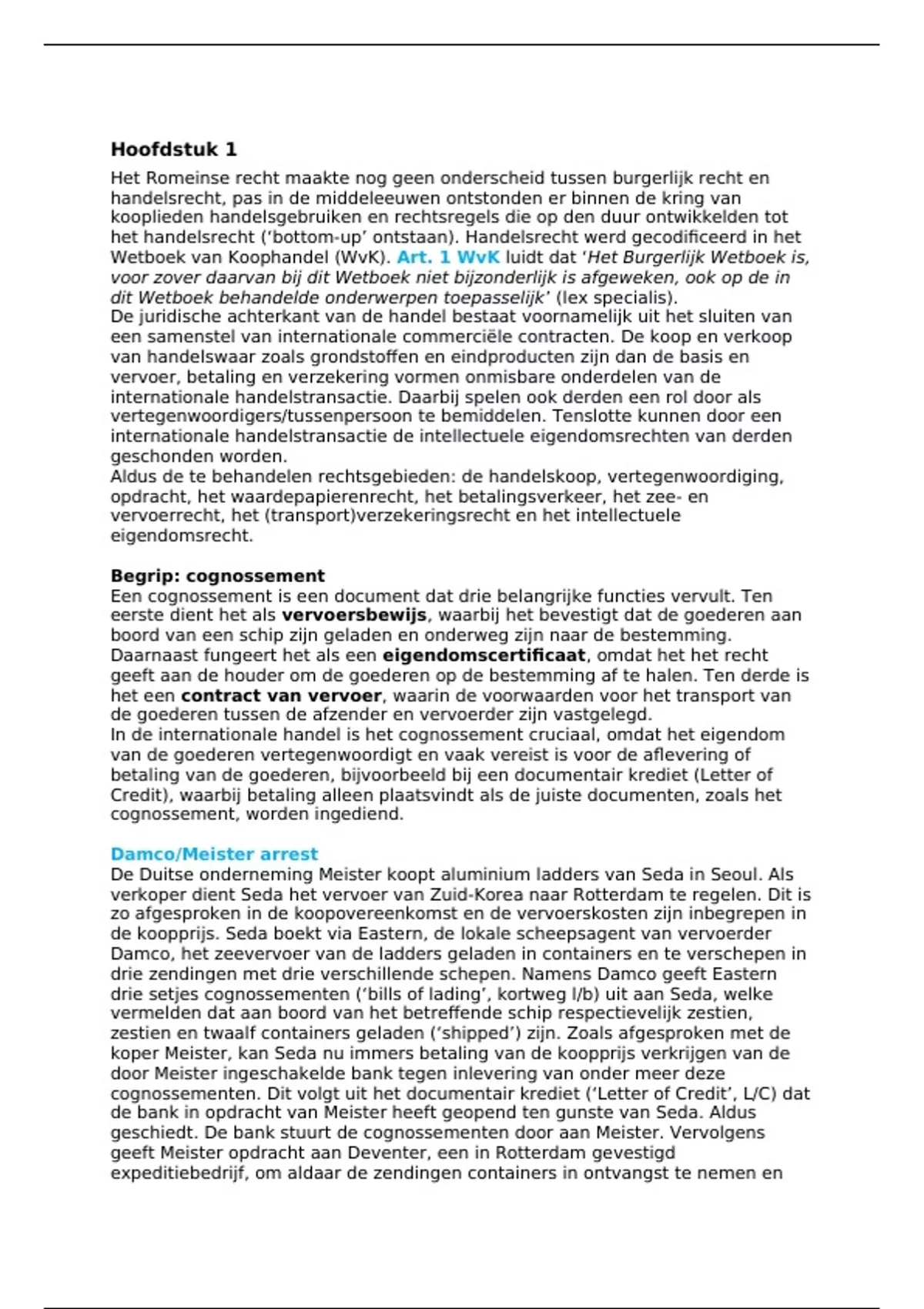 Deze uitgebreide samenvatting van Haven en Handel (hoofdstuk 1, 2, 3, 4, 5, 6 en 8) behandelt de belangrijkste juridische en economische aspecten van handelsrecht en internationale handel. Het document van 61 pagina's biedt een diepgaande maar overzichtelijke weergave van complexe onderwerpen zoals handelskoop, vervoersrecht, incoterms, aansprakelijkheid bij transport en internationale contracten. Inclusief samenvattingen van relevante arresten en praktijkvoorbeelden. Ideaal voor studenten rechten, economie en logistiek, maar ook nuttig voor professionals in de handelssector.
