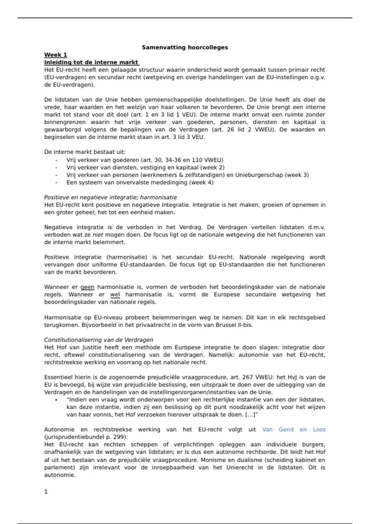 Cijfer behaald: 8 Uitgebreide samenvatting van de hoorcolleges van Recht van de Europese Unie