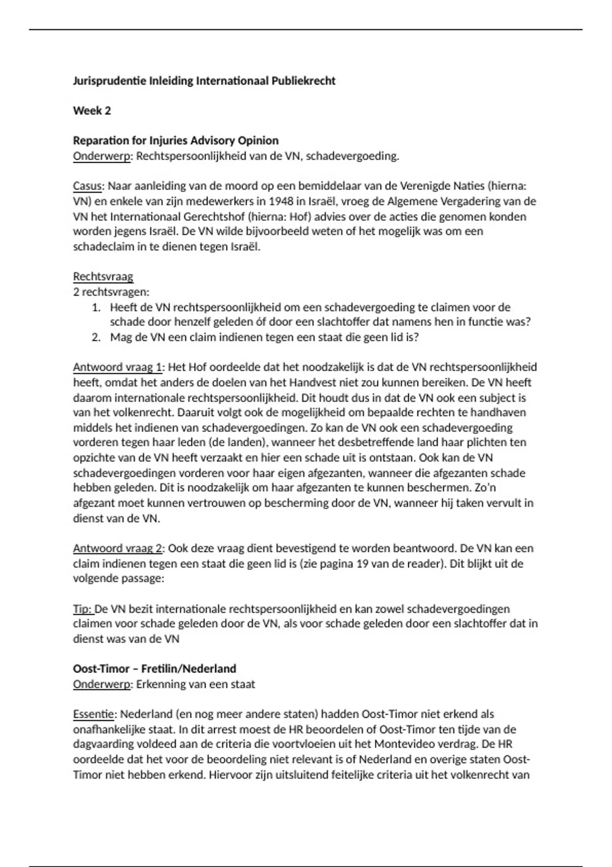 De arresten die in dit document zijn samengevat zijn de volgende: Reparation for Injuries Advisory Opinion, Oost-Timor – Fretilin/Nederland, ICJ North Sea Continental Shelf Case, I.C.J, Case Concerning Delimitation and Territorial Questions Between Qatar and Bahrain (Qatar v. Bahrain), I.C.J., Case Concerning East Timor (Portugal v. Australia), Democratic Republic of the Congo v. Rwanda, Application of the Genocide Convention, Nederland/ Nuhanovic, CJ Arrest Warrant Case (Congo v. Belgium), ICJ Jurisdictional Immunities of the State Case, Mothers of Srebrenica, Spoorwegstaking, Sanctieregeling Iran