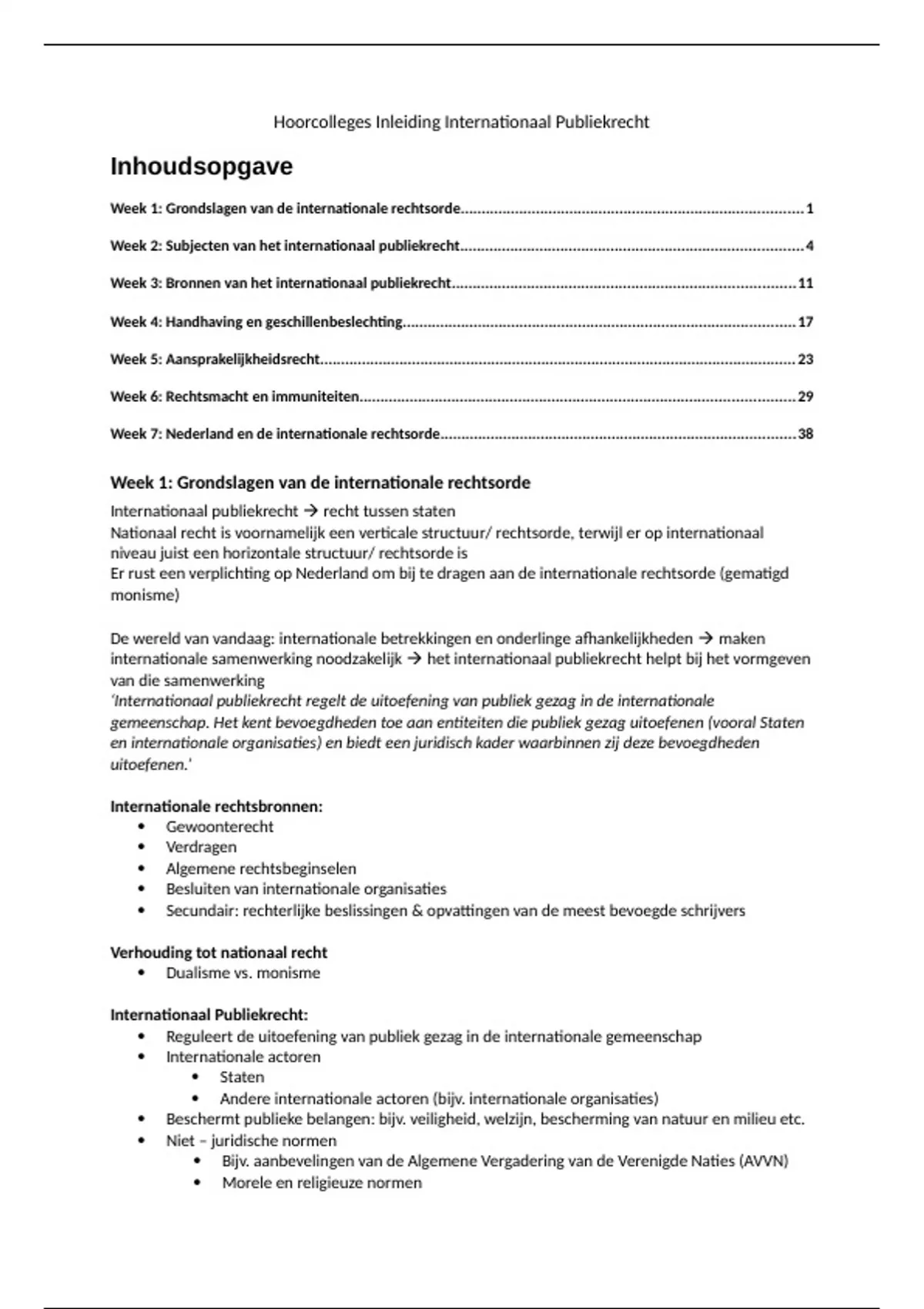 Dit document bevat aantekeningen van de hoorcolleges van Inleiding Internationaal Publiekrecht. Week 1: Grondslagen van de internationale rechtsorde. Week 2: Subjecten van het internationaal publiekrecht. Week 3: Bronnen van het internationaal publiekrecht. Week 4: Handhaving en geschillenbeslechting. Week 5: Aansprakelijkheidsrecht. Week 6: Rechtsmacht en immuniteiten. Week 7: Nederland en de internationale rechtsorde
