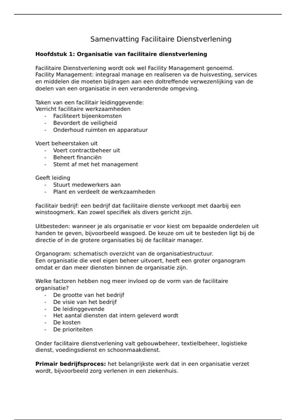 Deze samenvatting is gemaakt op basis van het vak Facilitaire Dienstverlening. Er komen onderdelen aan bod zoals logistiek, voedingsdienst, schoonmaakdienst en textielbeheer. Doe er je voordeel mee!
