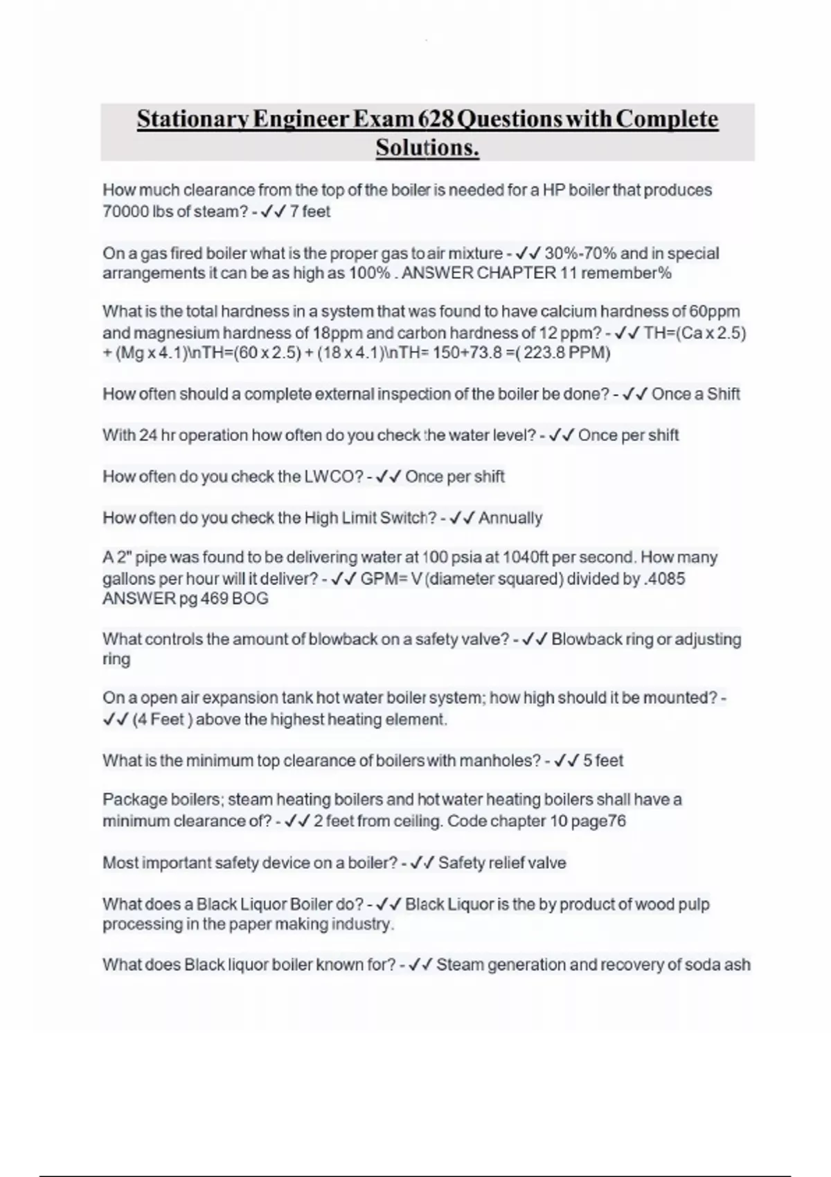 How much clearance from the top of the boiler is needed for a HP boiler that produces 70000 lbs of steam? - 7 feet On a gas fired boiler what is the proper gas to air mixture - 30%-70% and in special arrangements it can be as high as 100% . ANSWER CHAPTER 11 remember% What is the total hardness in a system that was found to have calcium hardness of 60ppm and magnesium hardness of 18ppm and carbon hardness of 12 ppm? - TH=(Ca x 2.5) + (Mg x 4.1)nTH=(60 x 2.5) + (18 x 4.1)nTH= 150+73.8 =( 223.8 PPM) How often should a complete external inspection of the boiler be done? - Once a Shift
