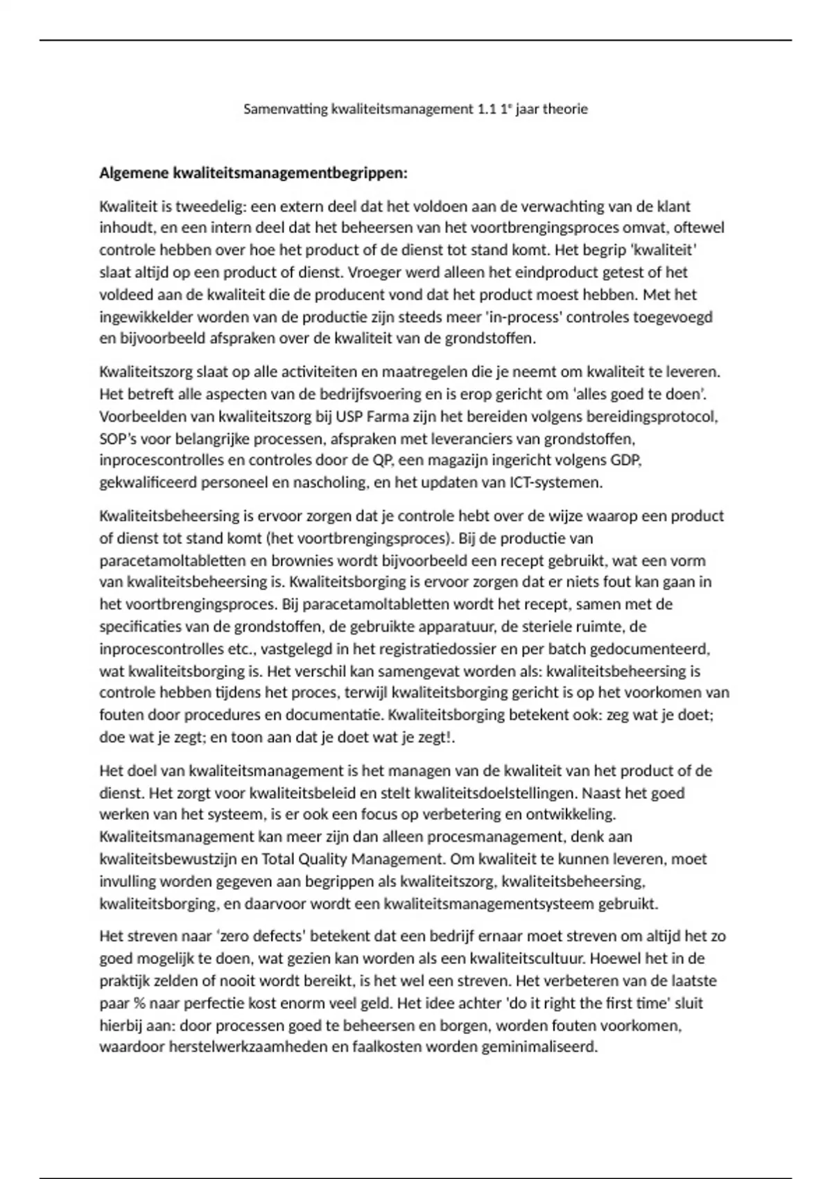 Samenvatting kwaliteitsmanagement 1.1 1e jaar theorie