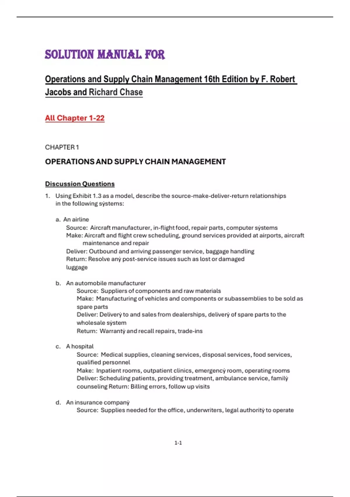 SOLUTION MANUAL FOR Operations and Supply Chain Management 16th Edition by F. Robert Jacobs and Richard Chase All Chapter 1-22