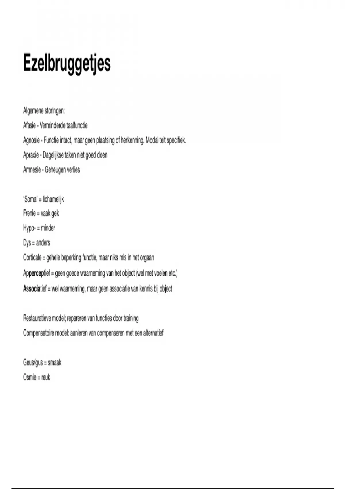 Een samenvatting in een handige tabel voor overhoren inclusief alle college aantekeningen en extra informatie over de hersenfuncties. Ik heb voor het deeltentamen met dit document een 9,4 gehaald. Succes met studeren!
