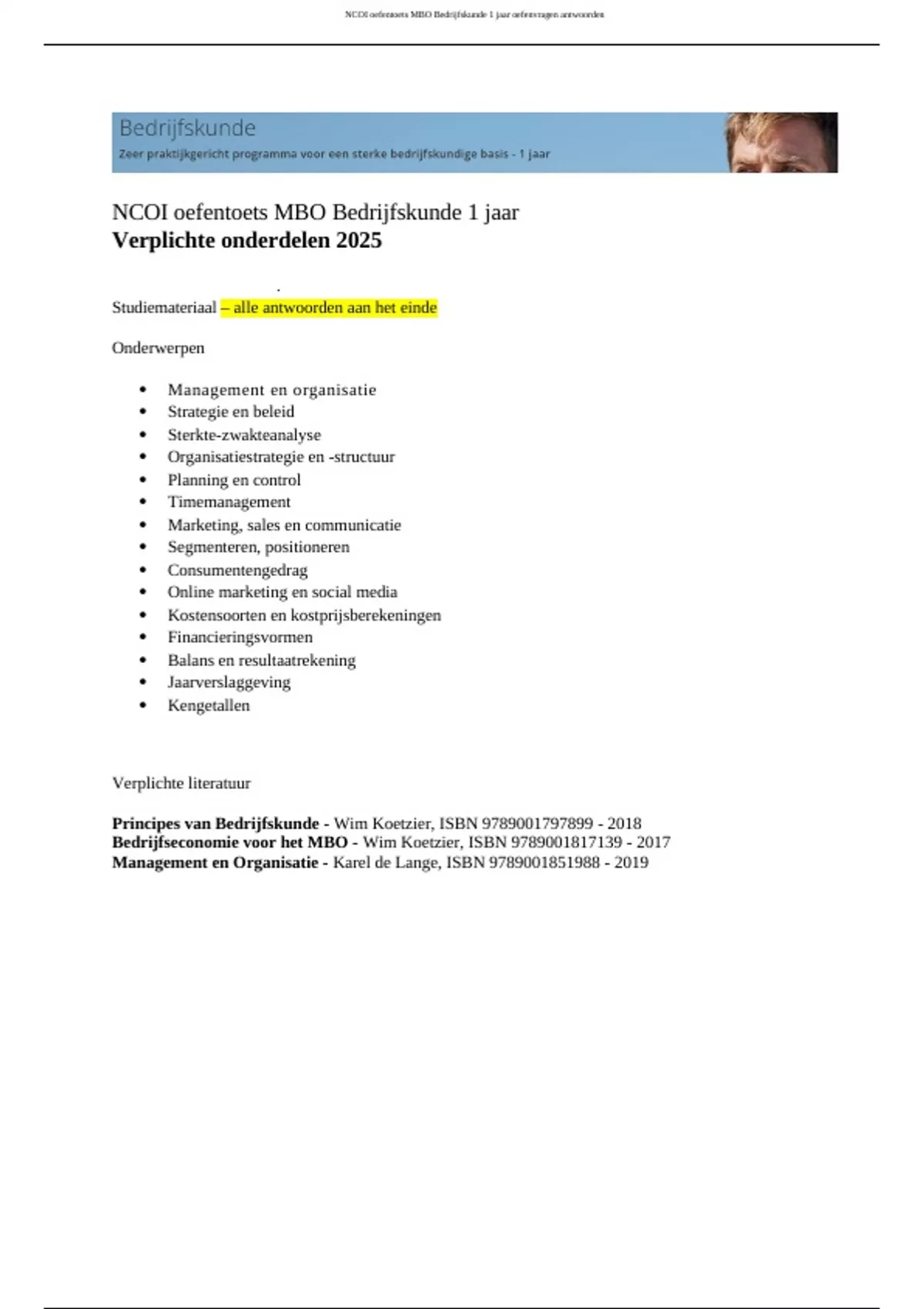 , NCOI oefentoets MBO Bedrijfskunde 1 jaar oefenvragen antwoorden