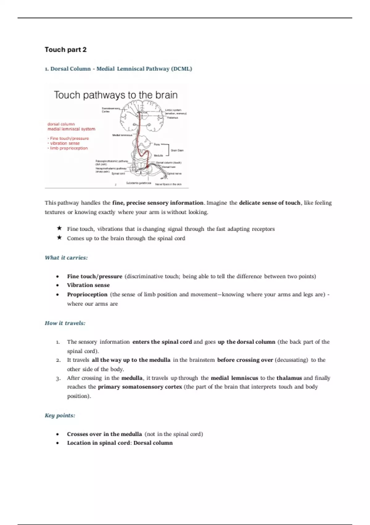 3. After crossing in the medulla, it travels up through the medial lemniscus to the thalamus and finally