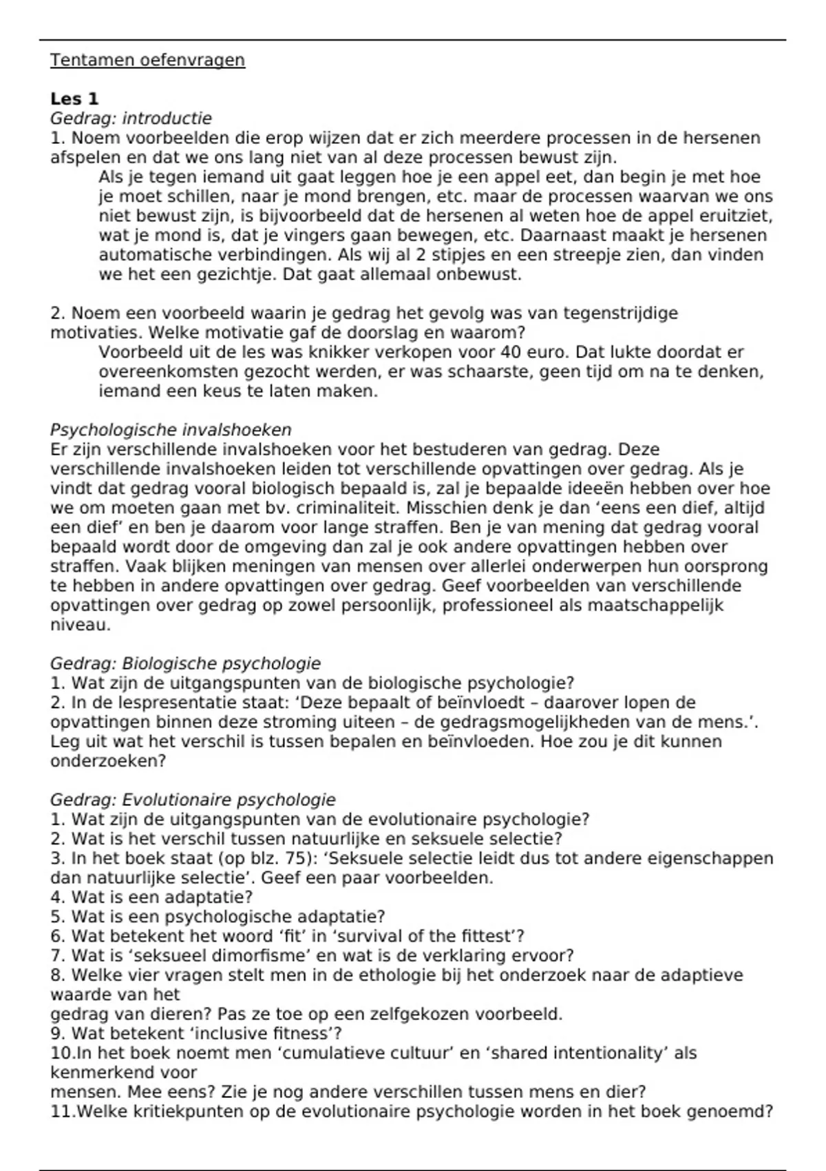 Uitgebreid document met oefenvragen voor het tentamen van hersenen en gedrag van de minor psychologie.