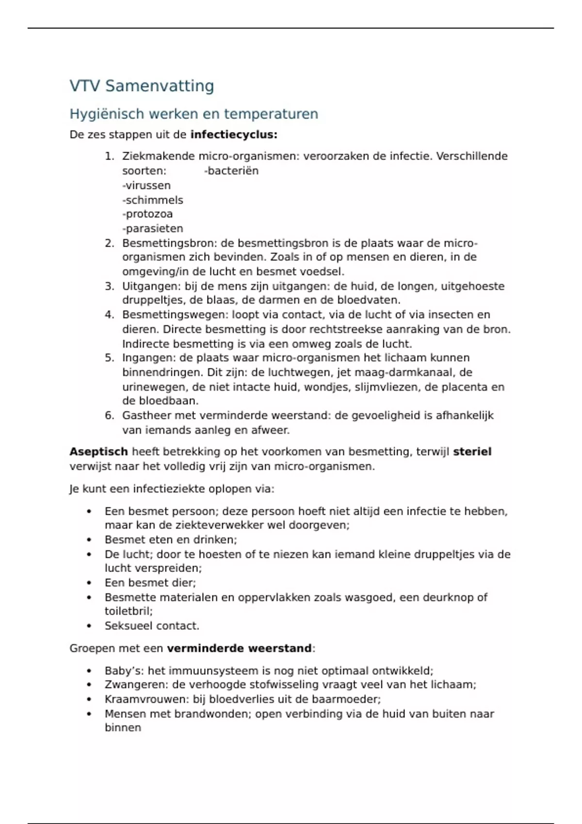 Samenvatting VTV semester 1 HAN . bevat volgende onderdelen: Hygiënisch werken en temperaturen Bewegingsondersteuning deel 1 en 2 Persoonlijke verzorging en uitscheiding Vitale functies meten Zuurstof toedienen Medicatietoediening Wondverzorging deel 1 en 2 ACT zwachtelen Heeft 34 pagina's en iets meer dan 12000 woorden.
