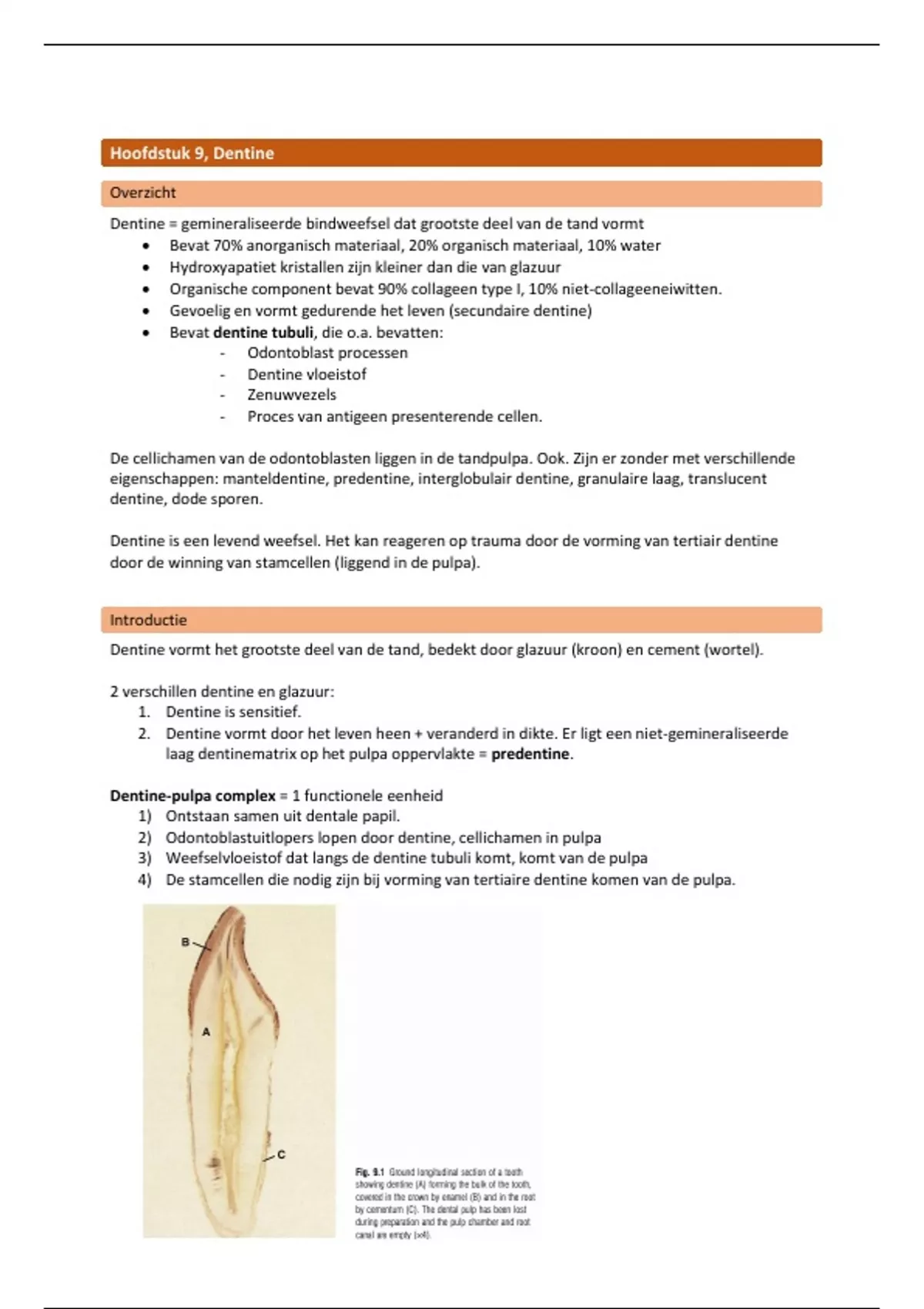 Dentine = gemineraliseerde bindweefsel dat grootste deel van de tand vormt