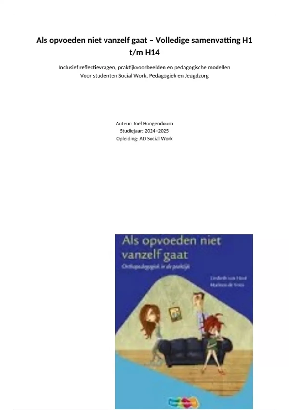Volledige samenvatting van Als opvoeden niet vanzelf gaat – Orthopedagogiek in de praktijk (Van Hoof & De Vries). Inclusief kernbegrippen, praktijkvoorbeelden, reflectievragen en uitleg van modellen zoals Kok en de regulatieve cyclus. Ideaal voor toetsing én praktijkgerichte opdrachten binnen AD Social Work, Pedagogiek en Jeugdzorg.