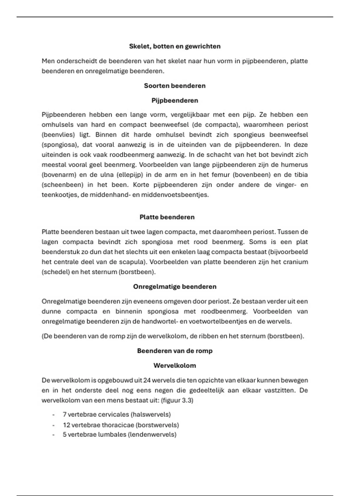 Het is een samenvatting van het hoofdstuk skelet uit het boek Kirchmann, L.L. e.a., Anatomie en fysiologie van de mens; inclusief veel voorkomende pathologie (2018) Houten: Bohn Stafleu Van Loghum; Hoofdstuk 3. hierin worden alle botten besproken en hun functies. Onderaan het document heb ik nog afbeeldingen toegevoegd deze staan in de tekst aan gegeven als bijvoorbeeld figuur 3.1. wanneer het document uitprint kan je de afbeeldingen naast de tekst houden waardoor het super makkelijk leert! leerdoelen die worden behandeld: 1. de structuur van het skelet van de schedel, de wervelkolom en de ledematen beschrijven en uitleggen hoe deze bijdragen aan het functioneren van het lichaam. 2. de Latijnse en Nederlandse benamingen van alle botten in het skelet opnoemen. 3. de verschillende soorten botverbindingen uitleggen, zoals vaste verbindingen en beweeglijke verbindingen, en hiervan voorbeelden geven. 4. uitleggen hoe gewrichten zijn opgebouwd en hoe de bouw varieert afhankelijk van het type gewricht (zoals scharniergewrichten, kogelgewrichten en draaigewrichten), en welke bewegingen elk type gewricht mogelijk maakt.