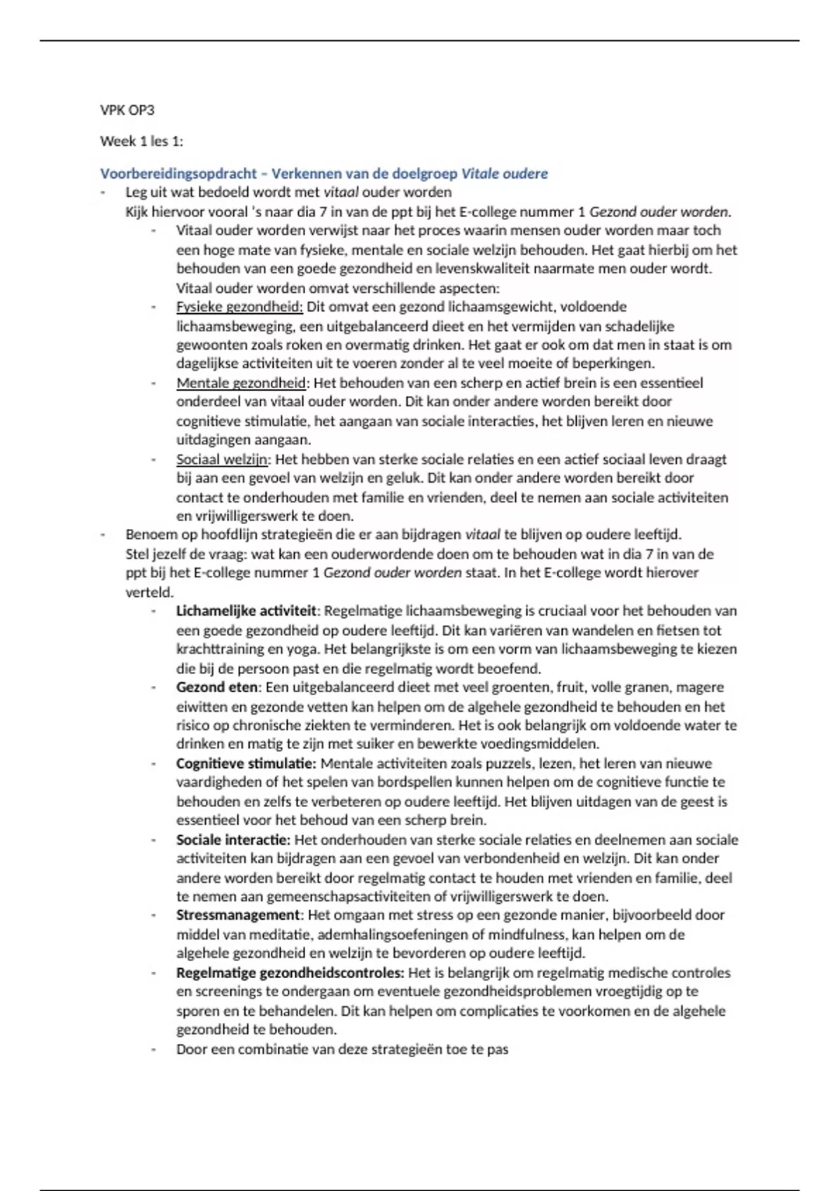 - Benoem op hoofdlijn strategieën die er aan bijdragen vitaal te blijven op oudere leeftijd.