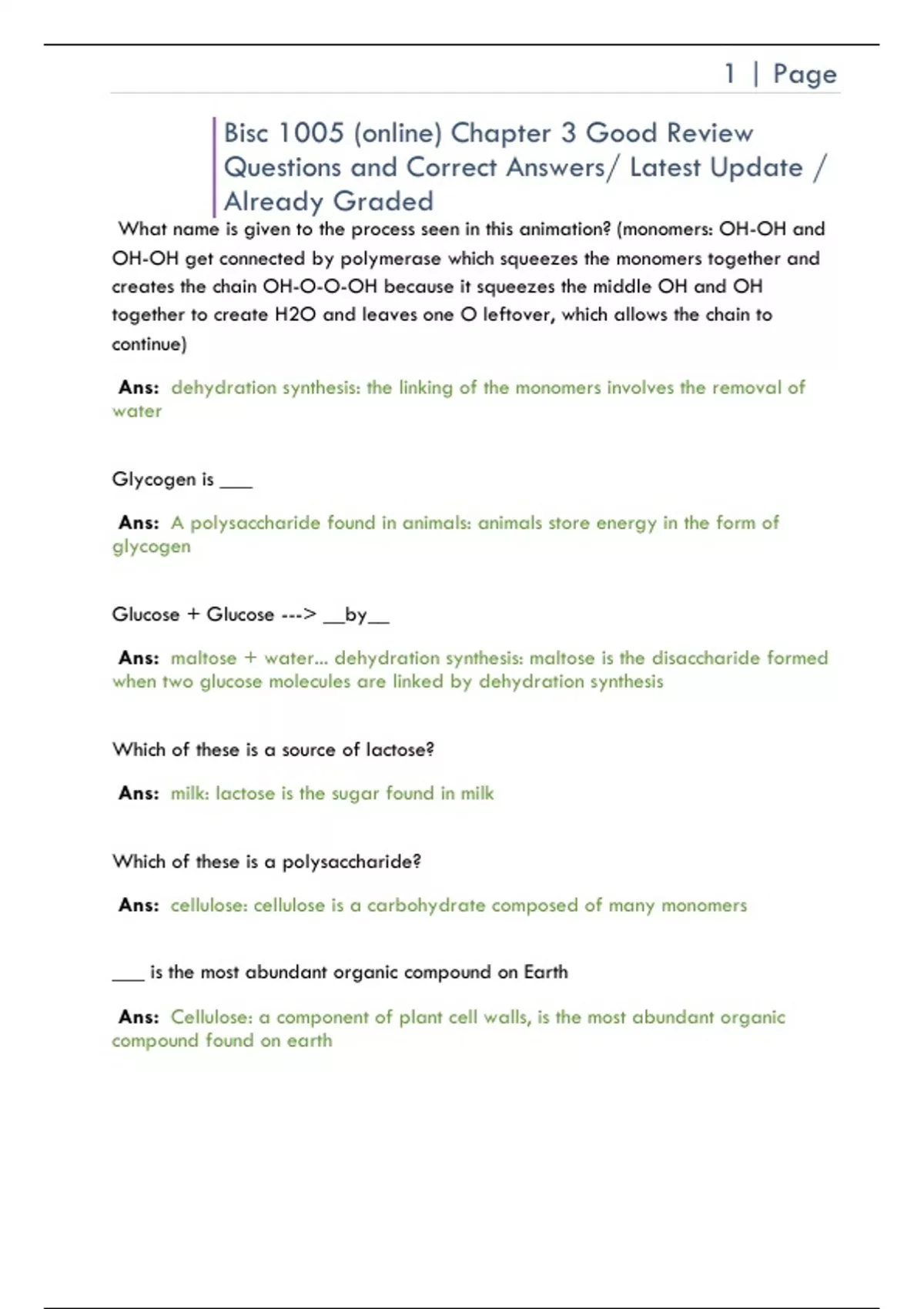 What name is given to the process seen in this animation? (monomers: OH-OH and OH-OH get connected by polymerase which squeezes the monomers together and creates the chain OH-O-O-OH because it squeezes the middle OH and OH together to create H2O and leaves one O leftover, which allows the chain to continue) Ans: dehydration synthesis: the linking of the monomers involves the removal of water Glycogen is ___ Ans: A polysaccharide found in animals: animals store energy in the form of glycogen Glucose + Glucose ---> __by__ Ans: maltose + water... dehydration synthesis: maltose is the disaccharide formed when two glucose molecules are linked by dehydration synthesis Which of these is a source of lactose? Ans: milk: lactose is the sugar found in milk Which of these is a polysaccharide? Ans: cellulose: cellulose is a carbohydrate composed of many monomers ___ is the most abundant organic compound on Earth Ans: Cellulose: a component of plant cell walls, is the most abundant organic compound found on earth 2 | Page Which of these is NOT a lipid? Ans: RNA: which is a nucleic acid This figure is an example of a: h h-c-c^o-c(h-n)-c(h-n)-c(h-n)-h h-c- c^o-c(h-n)-c(h-n)-c(h-n)-h h-c- c^o-c(h-n)-c(h-n)-c(h-n)-h h Ans: saturated fat which of these is a phospholipi