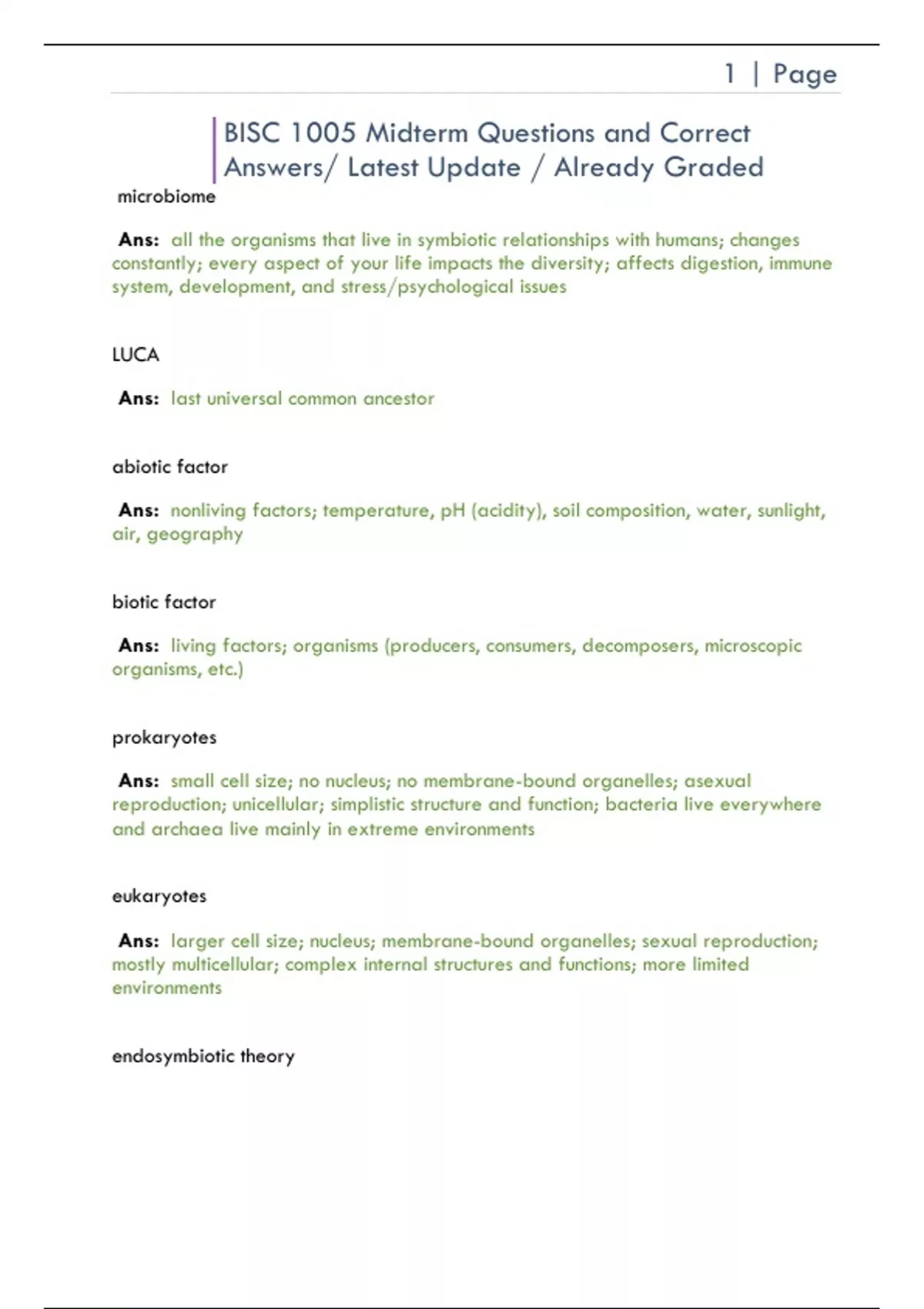 BISC 1005 Midterm Questions and Correct Answers/ Latest Update / Already Graded