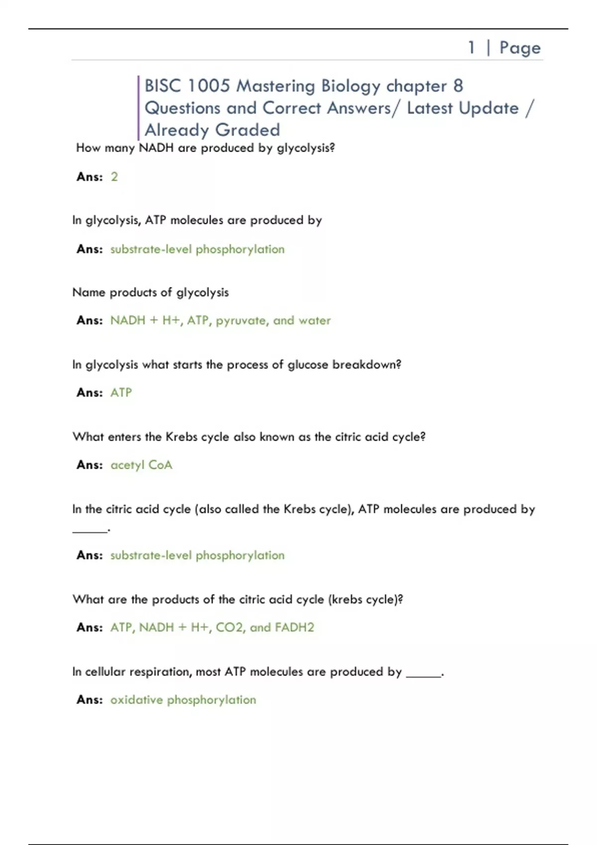 How many NADH are produced by glycolysis? Ans: 2 In glycolysis, ATP molecules are produced by Ans: substrate-level phosphorylation Name products of glycolysis Ans: NADH + H+, ATP, pyruvate, and water In glycolysis what starts the process of glucose breakdown? Ans: ATP What enters the Krebs cycle also known as the citric acid cycle? Ans: acetyl CoA In the citric acid cycle (also called the Krebs cycle), ATP molecules are produced by _____. Ans: substrate-level phosphorylation What are the products of the citric acid cycle (krebs cycle)? Ans: ATP, NADH + H+, CO2, and FADH2 In cellular respiration, most ATP molecules are produced by _____. Ans: oxidative phosphorylation 2 | Page For each glucose that enters glycolysis, _____ NADH enter the electron transport chain. Ans:
