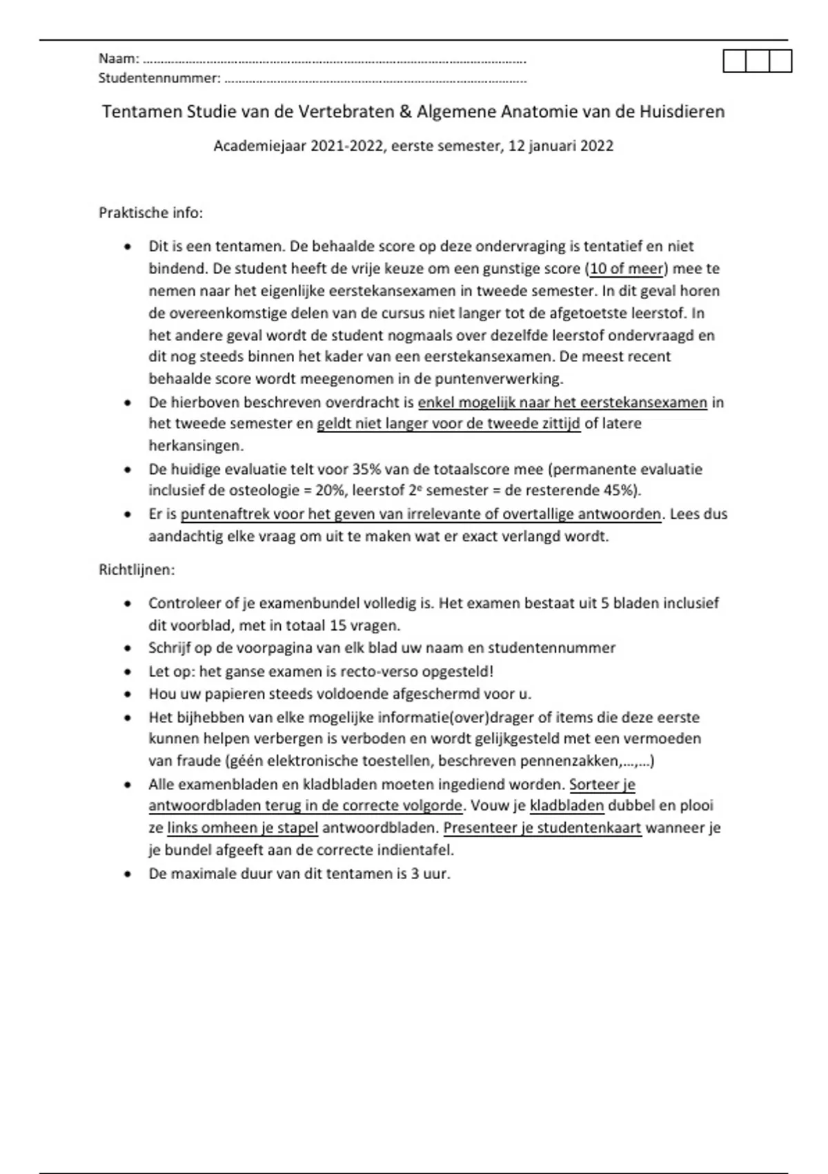 • Schrijf op de voorpagina van elk blad uw naam en studentennummer