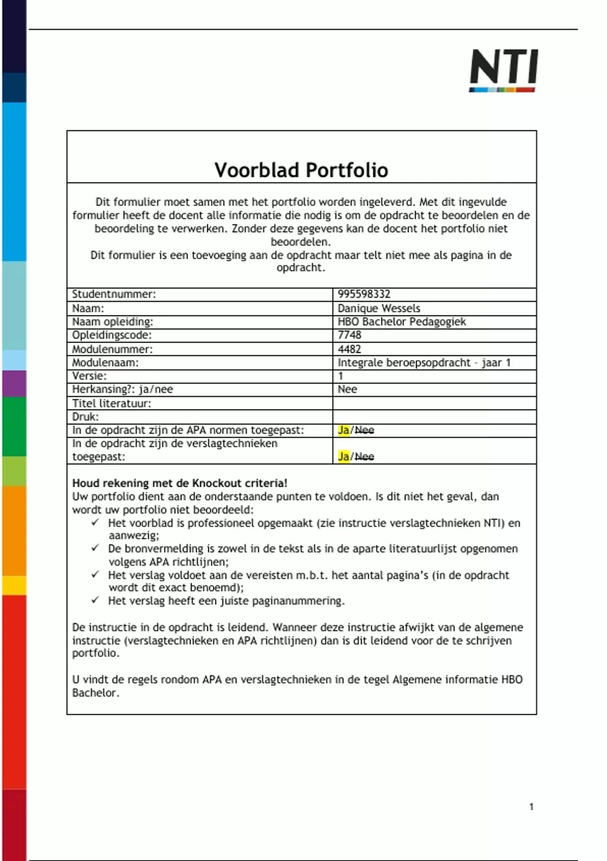 Dit formulier moet samen met het portfolio worden ingeleverd. Met dit ingevulde