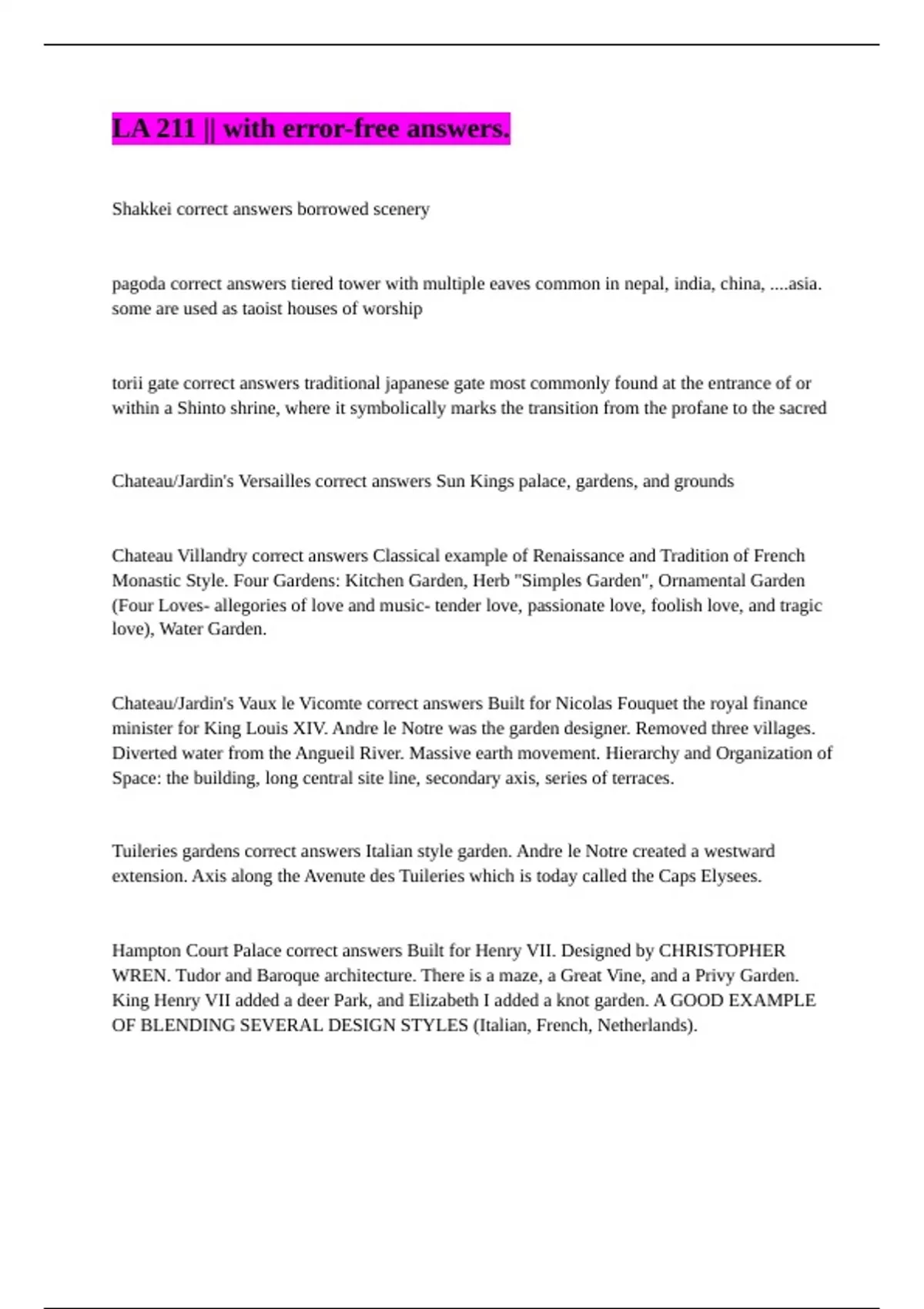 Shakkei correct answers borrowed scenery pagoda correct answers tiered tower with multiple eaves common in nepal, india, china, ....asia. some are used as taoist houses of worship torii gate correct answers traditional japanese gate most commonly found at the entrance of or within a Shinto shrine, where it symbolically marks the transition from the profane to the sacred Chateau/Jardin's Versailles correct answers Sun Kings palace, gardens, and grounds Chateau Villandry correct answers Classical example of Renaissance and Tradition of French Monastic Style. Four Gardens: Kitchen Garden, Herb "Simples Garden", Ornamental Garden (Four Loves- allegories of love and music- tender love, passionate love, foolish love, and tragic love), Water Garden. Chateau/Jardin's Vaux le Vicomte correct answers Built for Nicolas Fouquet the royal finance minister for King Louis XIV. Andre le Notre was the garden designer. Removed three villages. Diverted water from the Angueil River. Massive earth movement. Hierarchy and Organization of Space: the building, long central site line, secondary axis, series of terraces. Tuileries gardens correct answers Italian style garden. Andre le Notre created a westward extension. Axis along the Avenute des Tuileries which is today called the Caps Elysees. Hampton Court Palace correct answers Built for Henry VII. Designed by CHRISTOPHER WREN. Tudor and Baroque architecture. There is a maze, a Great Vine, and a Privy Garden. King Henry VII added a deer Park, and Elizabeth I added a knot garden. A GOOD EXAMPLE OF BLENDING SEVERAL DESIGN STYLES (Italian, French, Netherlands).