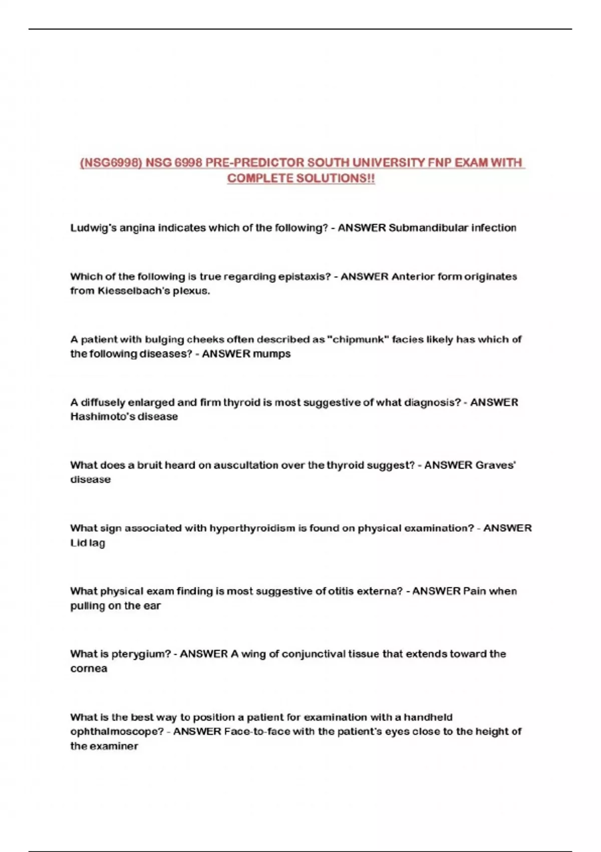 (NSG6998) NSG 6998 PRE-PREDICTOR SOUTH UNIVERSITY FNP EXAM WITH COMPLETE SOLUTIONS!!