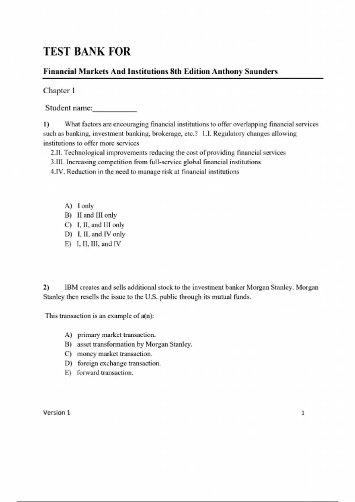 Test Bank for Financial Markets And Institutions 8th Edition Anthony Saunders. Full Chapters Include;....Part 1: Introduction and Overview of Financial Markets includes Chapter 1 – Introduction, Chapter 2 – Determinants of Interest Rates, Chapter 3 – Interest Rates and Security Valuation, and Chapter 4 – The Federal Reserve System, Monetary Policy, and Interest Rates. Part 2: Securities Markets consists of Chapter 5 – Money Markets, Chapter 6 – Bond Markets, Chapter 7 – Mortgage Markets, Chapter 8 – Stock Markets, Chapter 9 – Foreign Exchange Markets, and Chapter 10 – Derivative Securities Markets. Part 3: Commercial Banks contains Chapter 11 – Commercial Banks, Chapter 12 – Commercial Banks’ Financial Statements and Analysis, and Chapter 13 – Regulation of Commercial Banks. Part 4: Other Financial Institutions covers Chapter 14 – Other Lending Institutions, Chapter 15 – Insurance Companies, Chapter 16 – Securities Firms and Investment Banks, Chapter 17 – Investment Companies, Chapter 18 – Pension Funds, and Chapter 19 – Fintech Companies. Part 5: Risk Management in Financial Institutions includes Chapter 20 – Types of Risks Incurred by Financial Institutions, Chapter 21 – Managing Credit Risk on the Balance Sheet, Chapter 22 – Managing Liquidity Risk on the Balance Sheet, Chapter 23 – Managing Interest Rate Risk and Insolvency Risk on the Balance Sheet, Chapter 24 – Managing Risk off the Balance Sheet with Derivative Securities, and Chapter 25 – Managing Risk off the Balance Sheet with Loan Sales and Securitization.