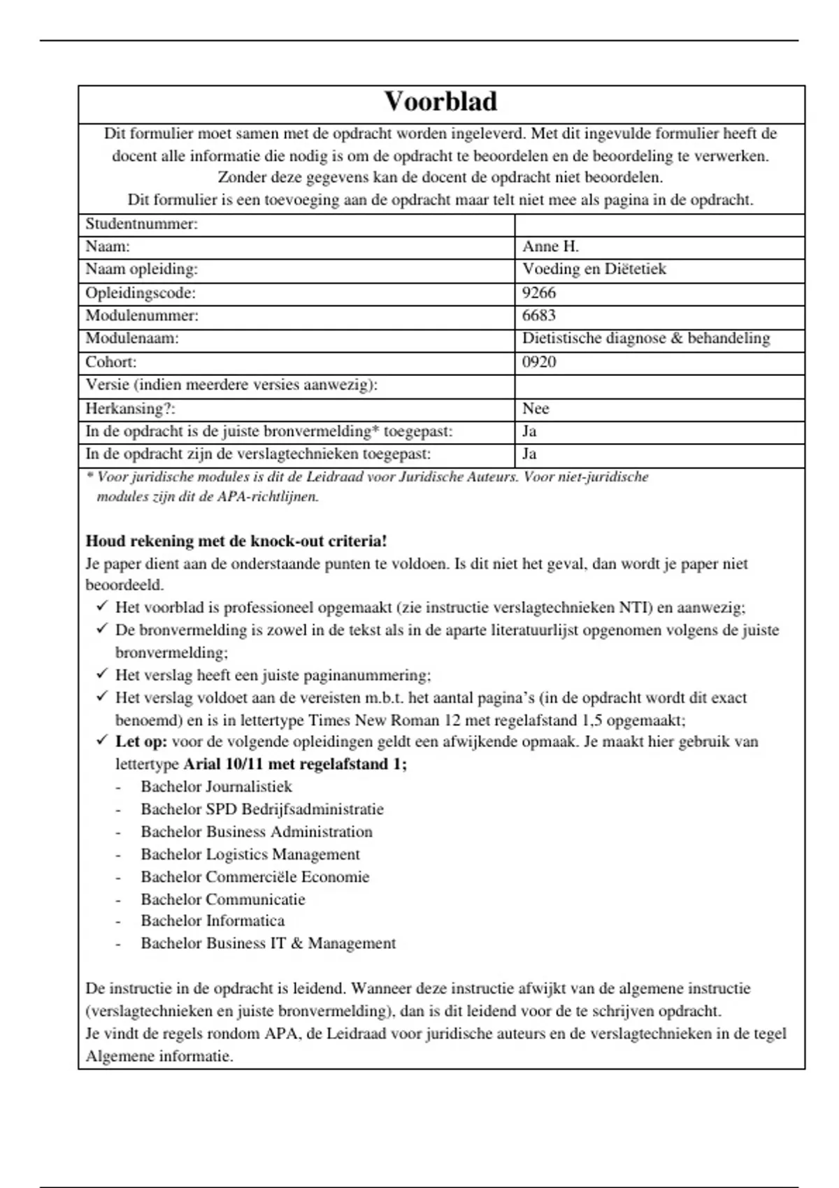 Zonder deze gegevens kan de docent de opdracht niet beoordelen.