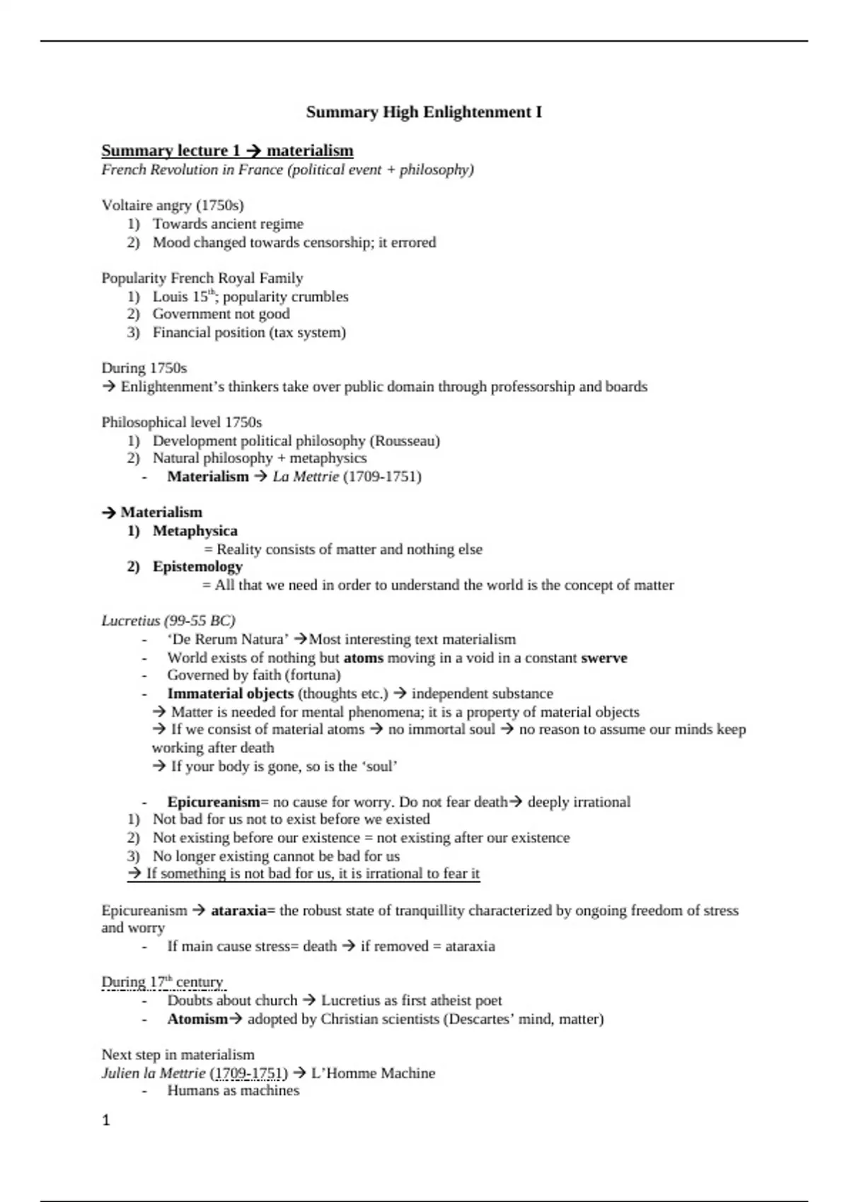 Summary lecture 1 materialism
