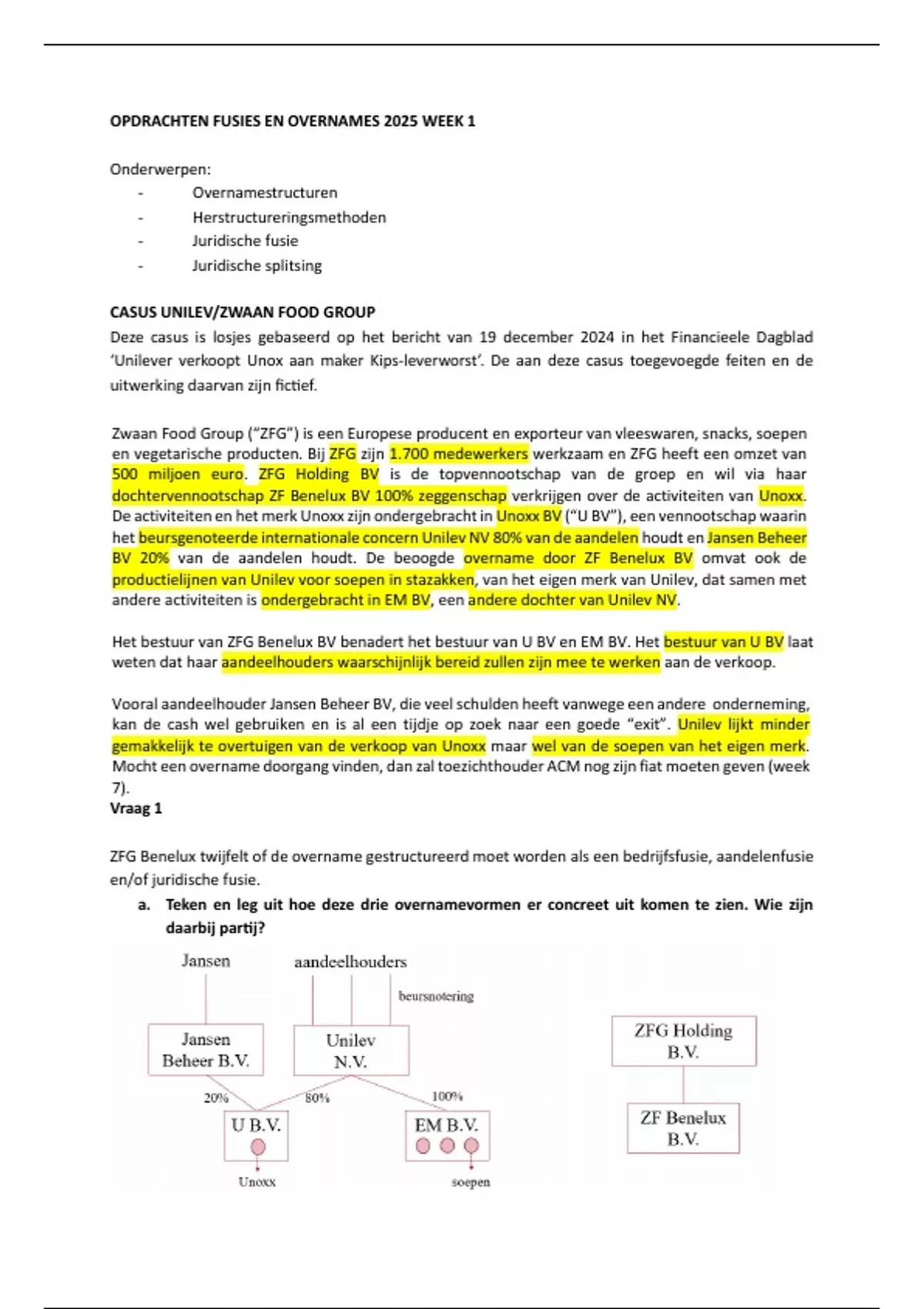 Complete en tentamengerichte werkgroepuitwerkingen – Fusies & Overnames en Joint Ventures (UvA ) Ben jij masterstudent Privaatrecht: Commerciële Rechtspraktijk aan de Universiteit van Amsterdam en volg je het vak Fusies & Overnames en Joint Ventures? Dan is dit document precies wat je nodig hebt. Uitgebreide en overzichtelijke uitwerkingen van alle werkgroepopdrachten (week 1 t/m 7) Volledig afgestemd op de stof en werkgroepen van het collegejaar Praktisch, helder en inhoudelijk sterk – ideaal als voorbereiding op het tentamen én werkgroepen Of je nu achterloopt, extra houvast zoekt of gestructureerd wilt studeren: deze uitwerkingen helpen je tijd besparen én scoren. Investeer slim in je voorbereiding – haal meer uit je studie, met minder stress.