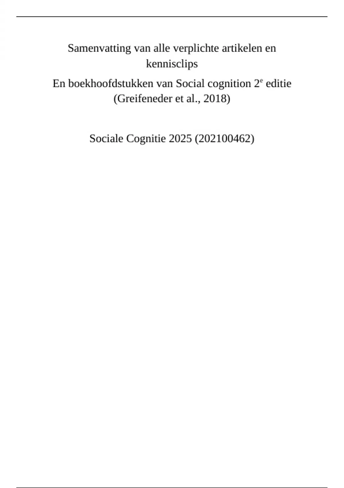 Samenvatting van alle artikelen, kennisclips en hoofdstukken voor het vak Sociale Cognitie () van het jaar . Dit zijn de hoofdstukken 1,2,3,4,5,6,7,8,9,10 uit de tweede editie van het boek Social Cognition van Greifeneder et al. (2018). De artikelen van Russell (2015), Todorov (2015), Schwartz (2004), Schwartz (2007), Smith (2014), Bohner & Dickel (2011), Hofmann, Schmeichel & Baddeley (2012), en Rand & Nowak (2013).