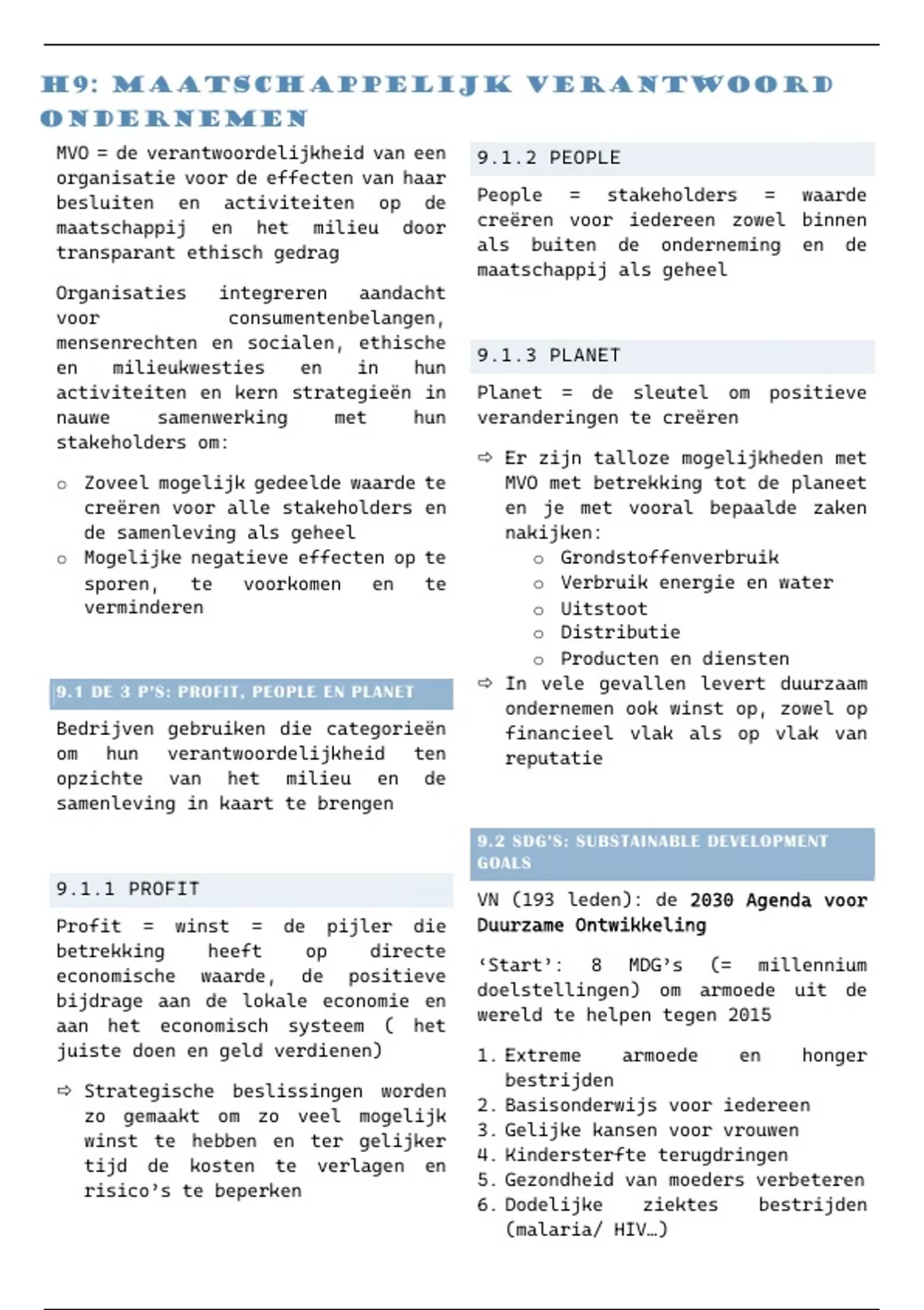 Volledige samenvatting van H9 maatschappelijk verantwoord ondernemen voor het vak Business fundamentals, dat gegeven wordt in het 1ste jaar. ideaal voor de examens en zeer overzichtelijk.