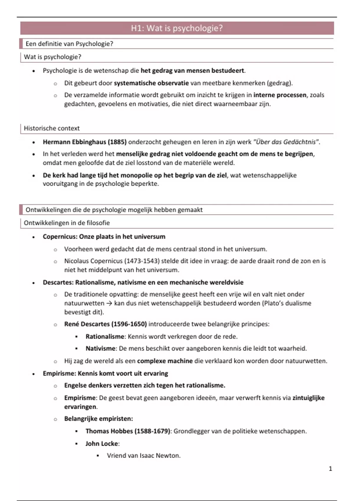 Deze uitgebreide samenvatting biedt een gestructureerd overzicht van de kernconcepten uit de algemene psychologie. De onderwerpen omvatten de definitie en geschiedenis van de psychologie, biologische en neurologische basis van gedrag, waarneming, aandacht, bewustzijn, leren, geheugen, emoties, motivatie en slaap. Ook psychologische stromingen zoals het behaviorisme, psychoanalyse en cognitieve psychologie worden behandeld. Ideaal voor studenten in de bachelor Psychologie of aanverwante opleidingen.