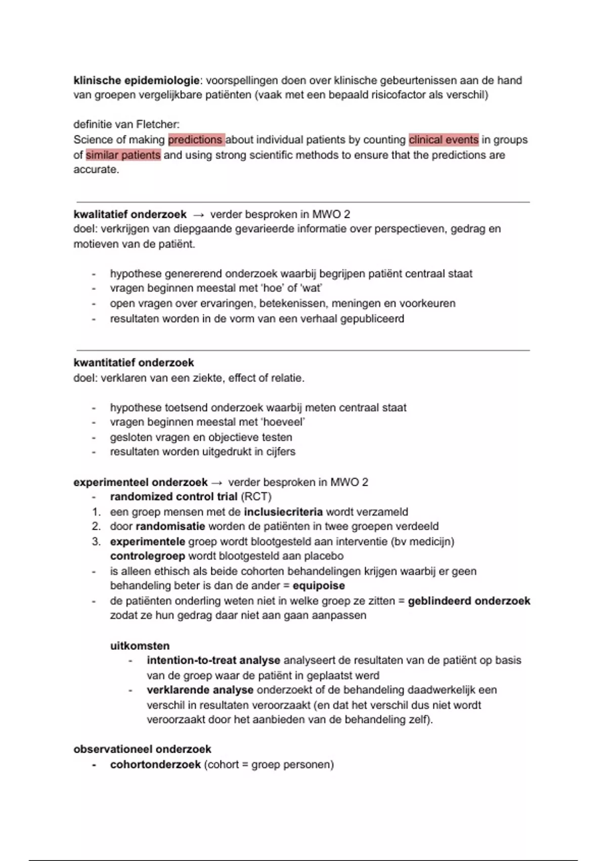 Duidelijk en compleet overzicht van de klinische epidemiologie (soorten onderzoek, uitkomsten, etc.) van het vak MWO 1 van jaar 1 geneeskunde aan de VU.