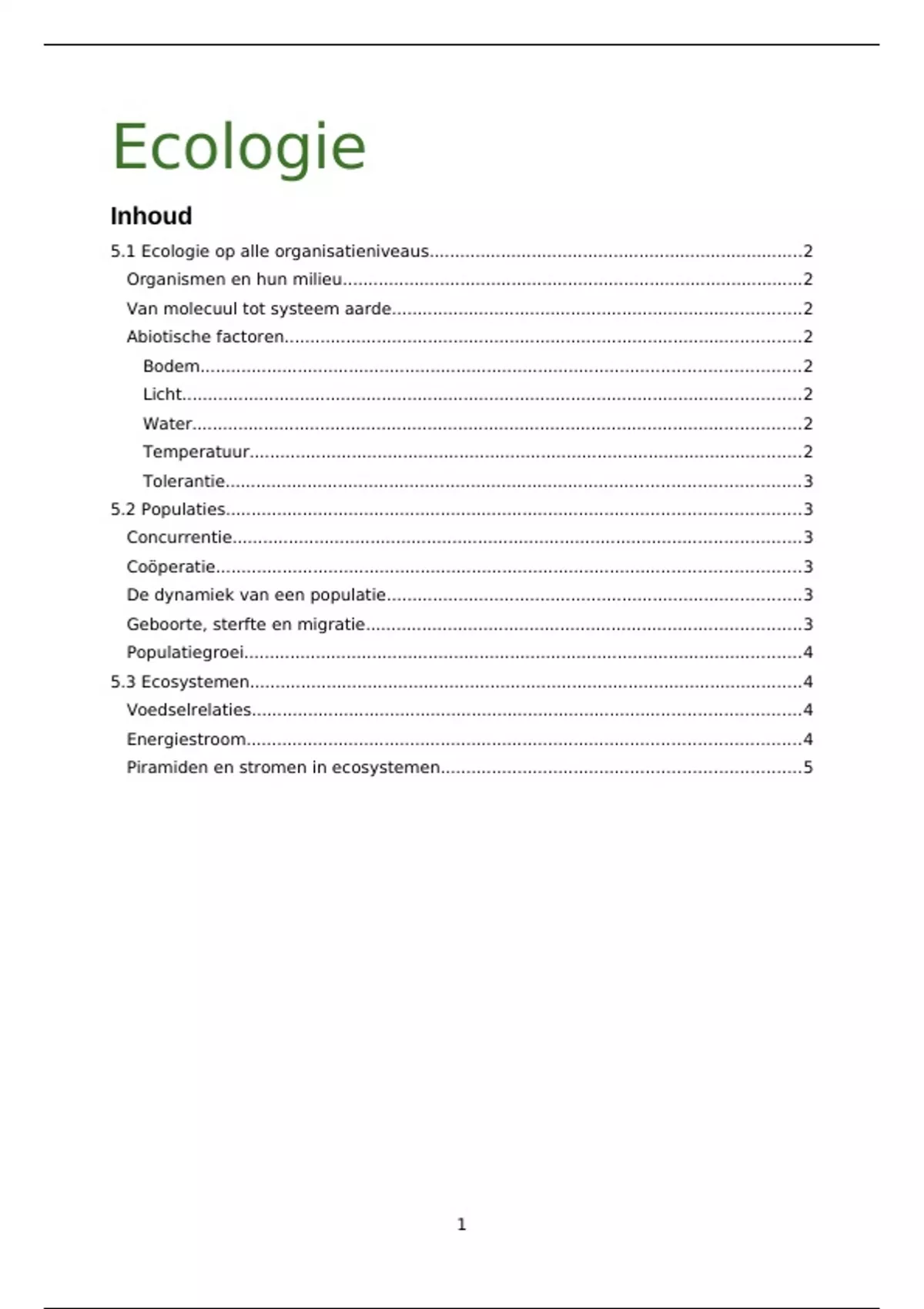 Een uitgebreide samenvatting over de paragraven: 5.1 (Ecologie op alle organisatieniveaus), 5.2 (Populaties) & 5.3 (Ecosystemen). Alle begrippen worden behandeld, met plaatjes en compacte duidelijke tekst.