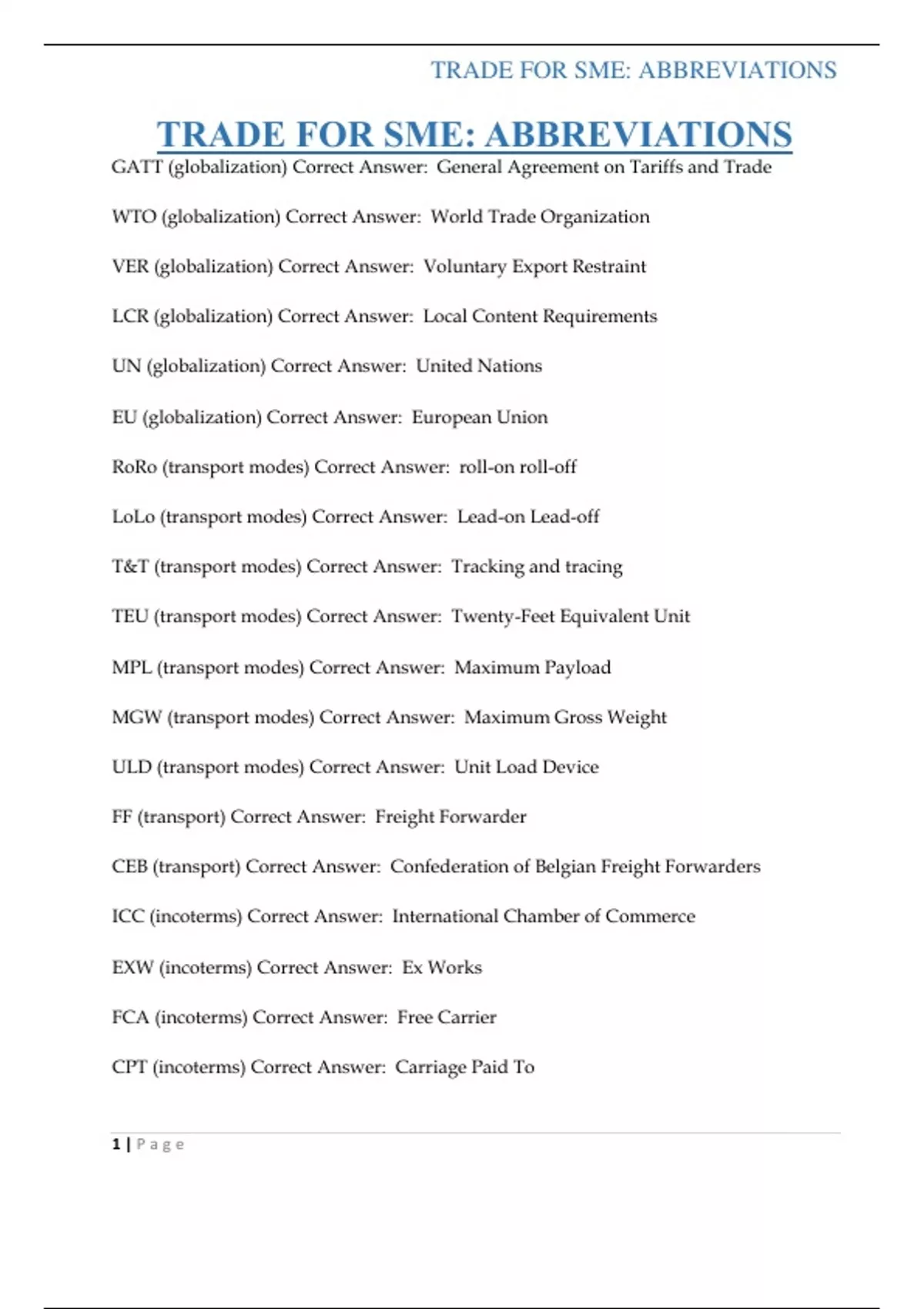 TRADE FOR SME: ABBREVIATIONS GATT (globalization) Correct Answer: General Agreement on Tariffs and Trade WTO (globalization) Correct Answer: World Trade Organization VER (globalization) Correct Answer: Voluntary Export Restraint LCR (globalization) Correct Answer: Local Content Requirements UN (globalization) Correct Answer: United Nations EU (globalization) Correct Answer: European Union RoRo (transport modes) Correct Answer: roll-on roll-off LoLo (transport modes) Correct Answer: Lead-on Lead-off T&T (transport modes) Correct Answer: Tracking and tracing TEU (transport modes) Correct Answer: Twenty-Feet Equivalent Unit MPL (transport modes) Correct Answer: Maximum Payload MGW (transport modes) Correct Answer: Maximum Gross Weight ULD (transport modes) Correct Answer: Unit Load Device FF (transport) Correct Answer: Freight Forwarder CEB (transport) Correct Answer: Confederation of Belgian Freight Forwarders ICC (incoterms) Correct Answer: International Chamber of Commerce EXW (incoterms) Correct Answer: Ex Works FCA (incoterms) Correct Answer: Free Carrier CPT (incoterms) Correct Answer: Carriage Paid To