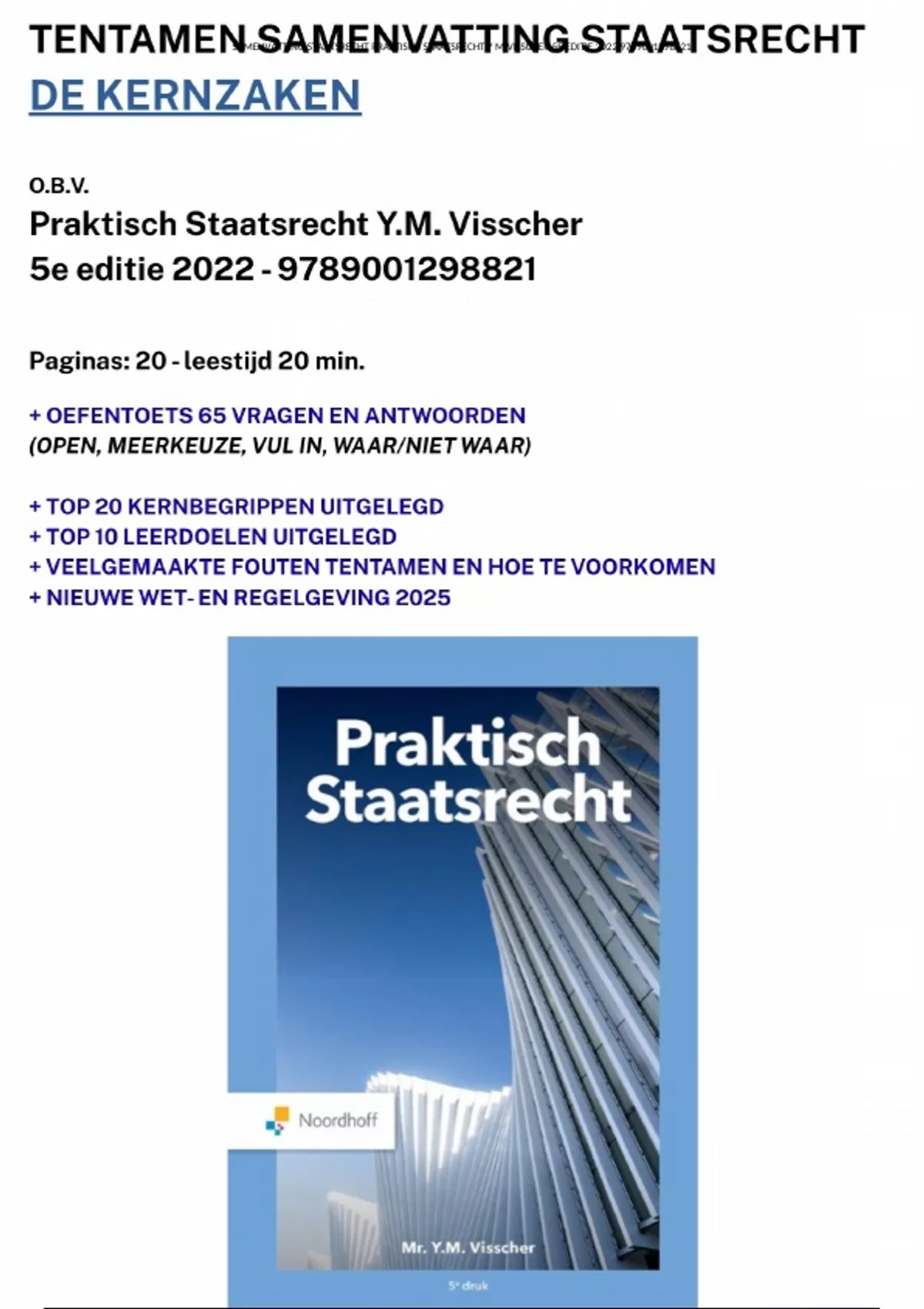 Tentamen samenvatting (20 pag) Praktisch Staatsrecht Y.M. Visscher - 5e editie 2022 - DE KERNZAKEN + oefentoets + leerdoelen + kernbegrippen - UPDATE wet-regelgeving 2025