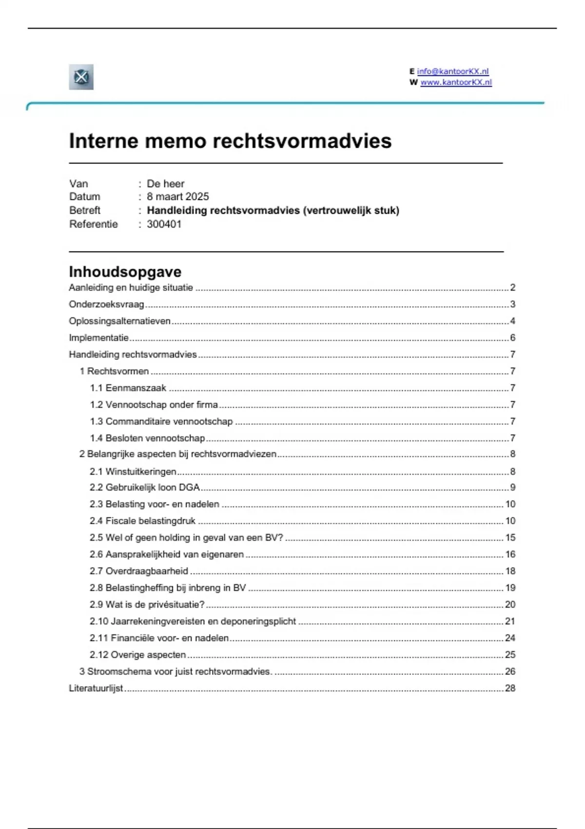 Betreft : Handleiding rechtsvormadvies (vertrouwelijk stuk)