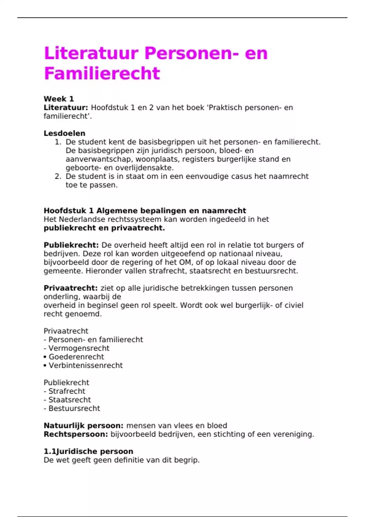 Ben je op zoek naar een duidelijke en gestructureerde samenvatting van het vak Personen- en Familierecht? Deze uitgebreide samenvatting is opgebouwd per week en bevat zowel de essentiële literatuur als waardevolle aantekeningen van de hoorcolleges. Ideaal voor tentamenvoorbereiding of verdieping! Behaald met een 9! Deze samenvatting heeft zich al bewezen in de praktijk. Door de combinatie van theorie en college-inzichten is dit een perfect hulpmiddel voor elke rechtenstudent die het vak wil begrijpen én hoog wil scoren. Wat je kunt verwachten: Heldere uitleg van complexe juridische begrippen Overzichtelijke structuur per week Toegankelijke taal, maar juridisch correct.