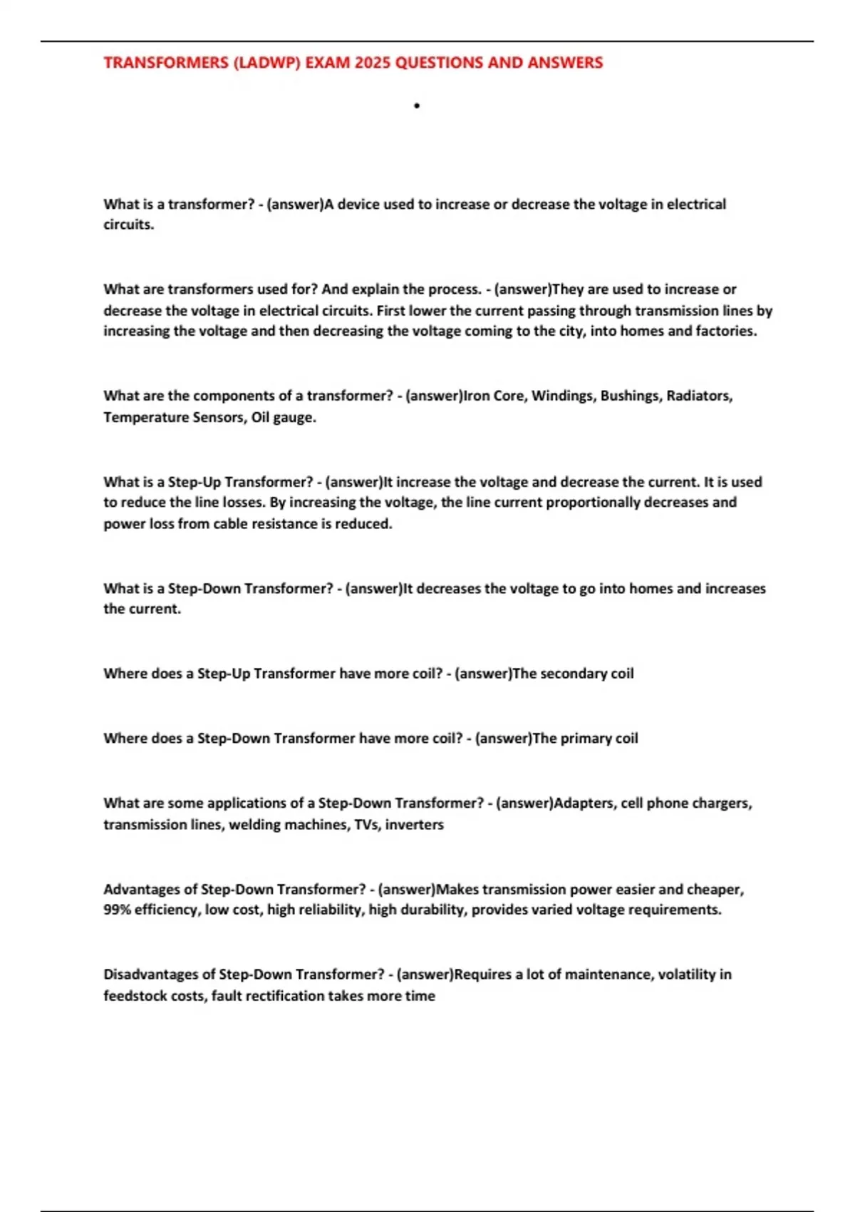 TRANSFORMERS (LADWP) EXAM 2025 QUESTIONS AND ANSWERS