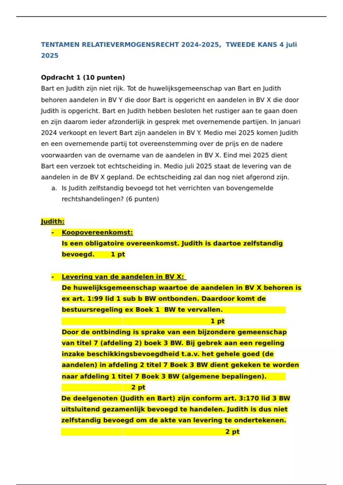 2024 verkoopt en levert Bart zijn aandelen in BV Y. Medio mei 2025 komen Judith