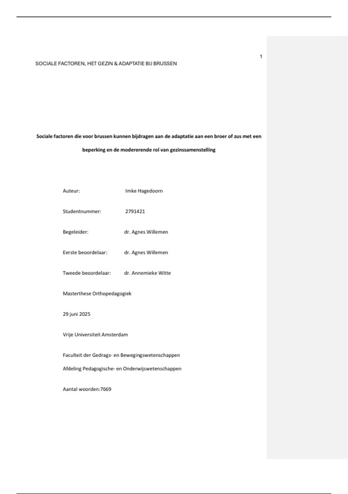Dit document is een masterthese (scriptie) geschreven voor de master Pedagogische Wetenschappen track Orthopedagogiek aan de Vrije Universiteit in Amsterdam. In deze scriptie is het onderwerp de relatie tussen sociale steun voor brussen en adaptatie aan hun broer of zus met beperking en de modererende rol van gezinssamenstelling op deze relatie onderzocht. Het is een kwantitatief correlationeel onderzoek waarbij er een multivariate regressieanalyse en een moderatieanalyse is gebruikt.