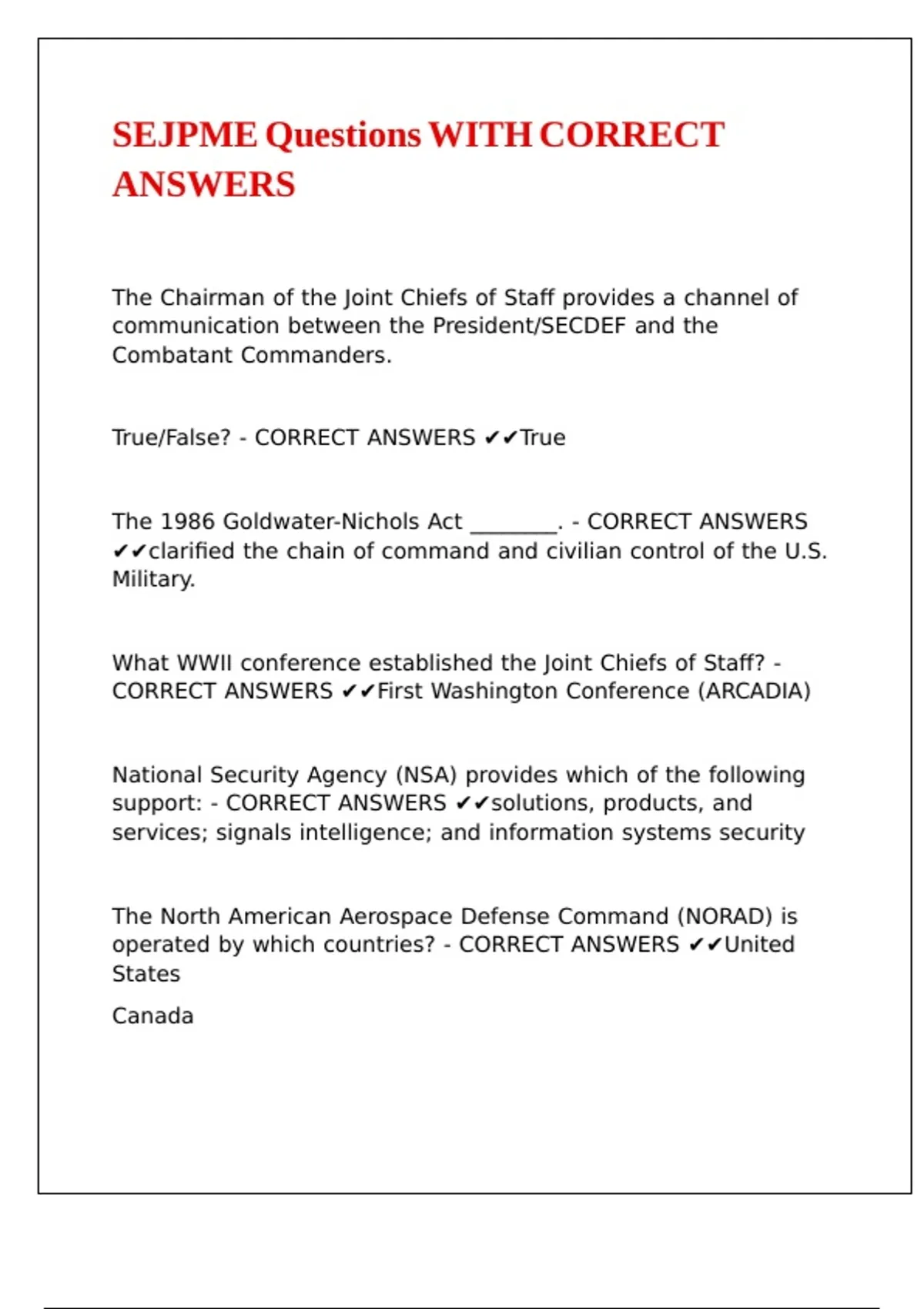 - CORRECT ANSWERS ✔✔Combatant Commanders