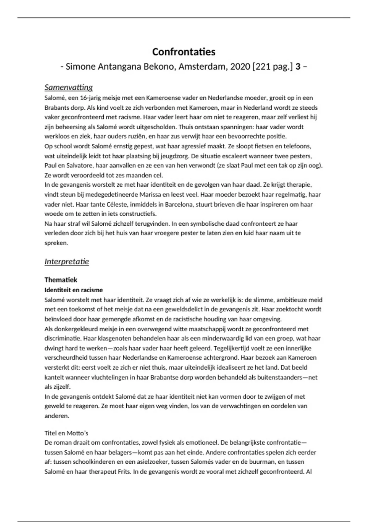 Deze analyse van Confrontaties van Simone Atangana Bekono onderzoekt de centrale thema’s, personages en stijl van de roman. Het verhaal gaat over identiteit, culturele botsingen en de zoektocht naar zelfacceptatie in een multiculturele samenleving. De analyse bespreekt hoe Bekono op indringende wijze sociale en persoonlijke conflicten verweeft, en hoe haar realistische en direct geschreven stijl de emoties en dilemma’s van de hoofdpersonen krachtig overbrengt.