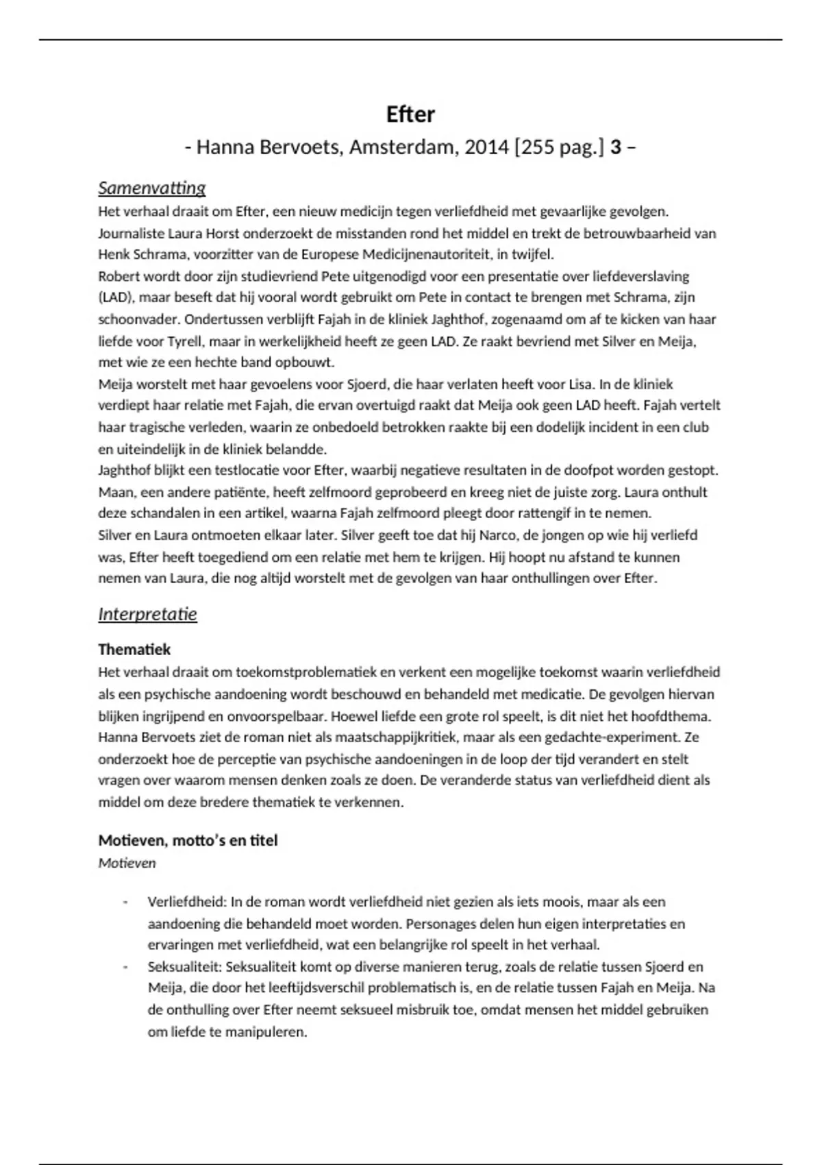 Deze analyse van Efterhanna van Hanna Bervoets onderzoekt de thema’s, personages en stijl van de roman. Het verhaal draait om identiteit, persoonlijke vrijheid en de zoektocht naar zingeving in een complexe wereld. De analyse belicht Bervoets’ eigentijdse en vaak confronterende vertelwijze, haar scherpzinnige observaties van sociale relaties, en hoe ze met haar directe stijl maatschappelijke en existentiële vragen oproept binnen de moderne literatuur.