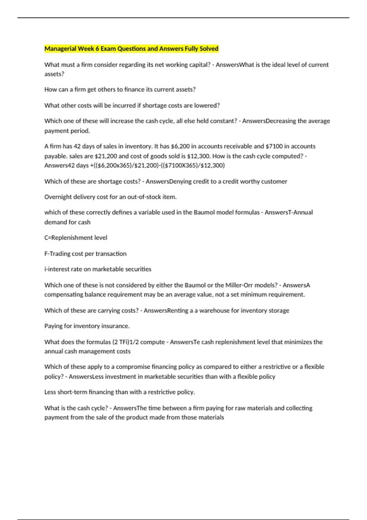 Managerial Week 6 Exam Questions and Answers Fully Solved What must a firm consider regarding its net working capital? - AnswersWhat is the ideal level of current assets? How can a firm get others to finance its current assets? What other costs will be incurred if shortage costs are lowered? Which one of these will increase the cash cycle, all else held constant? - AnswersDecreasing the average payment period. A firm has 42 days of sales in inventory. It has $6,200 in accounts receivable and $7100 in accounts payable. sales are $21,200 and cost of goods sold is $12,300. How is the cash cycle computed? - Answers42 days +(($6,200x365)/$21,200)-(($7100X365)/$12,300) Which of these are shortage costs? - AnswersDenying credit to a credit worthy customer Overnight delivery cost for an out-of-stock item. which of these correctly defines a variable used in the Baumol model formulas - AnswersT-Annual demand for cash C=Replenishment level F-Trading cost per transaction i-interest rate on marketable securities Which one of these is not considered by either the Baumol or the Miller-Orr models? - AnswersA compensating balance requirement may be an average value, not a set minimum requirement. Which of these are carrying costs? - AnswersRenting a a warehouse for inventory storage Paying for inventory insurance. What does the formulas (2 TFi)1/2 compute - AnswersTe cash replenishment level that minimizes the annual cash management costs Which of these apply to a compromise financing policy as compared to either a restrictive or a flexible policy? - AnswersLess investment in marketable securities than with a flexible policy Less short-term financing than with a restrictive policy. What is the cash cycle? - AnswersThe time between a firm paying for raw materials and collecting payment from the sale of the product made from those materials Roger's electric needs $40,000 for an expansion project. How much will the firm need to borrow if the bank requires a compensating balance equal to 5 percent of the loan amount. - AnswersLoan amount = $40,000 /(1-0.05) Which of these are shortage costs? - AnswersForfeiting a quantity discount because the order